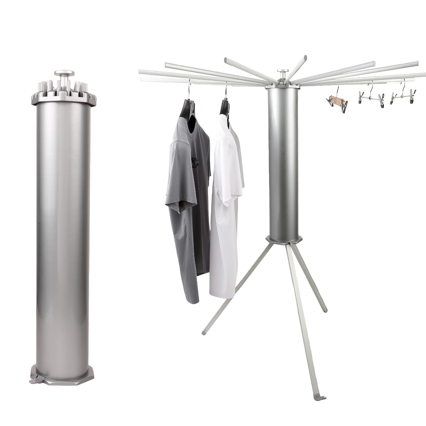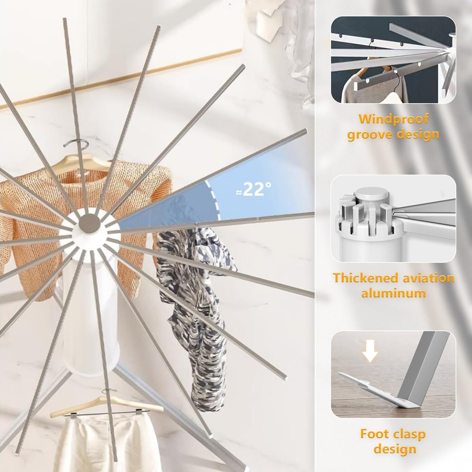 Material: Hochwertiges Aluminium Höhe (aufgeklappt): 118 cm Durchmesser (aufgeklappt): 110 cm Höhe (zusammengeklappt): 70 cm Durchmesser (zusammengeklappt): 14,5 cm Anzahl der Stangen: 16 unabhängig herausziehbare Stangen Platzsparende Aufbewahrung: Lässt sich mühelos zusammenklappen Stabilität: Robuste Verarbeitung und hohe Stabilität auch bei voller Beladung Design: Ansprechendes Design für harmonische Integration in jede Umgebung Vielseitigkeit: Geeignet für Innen- und Außenbereich, leicht zu transportieren und aufzubauen