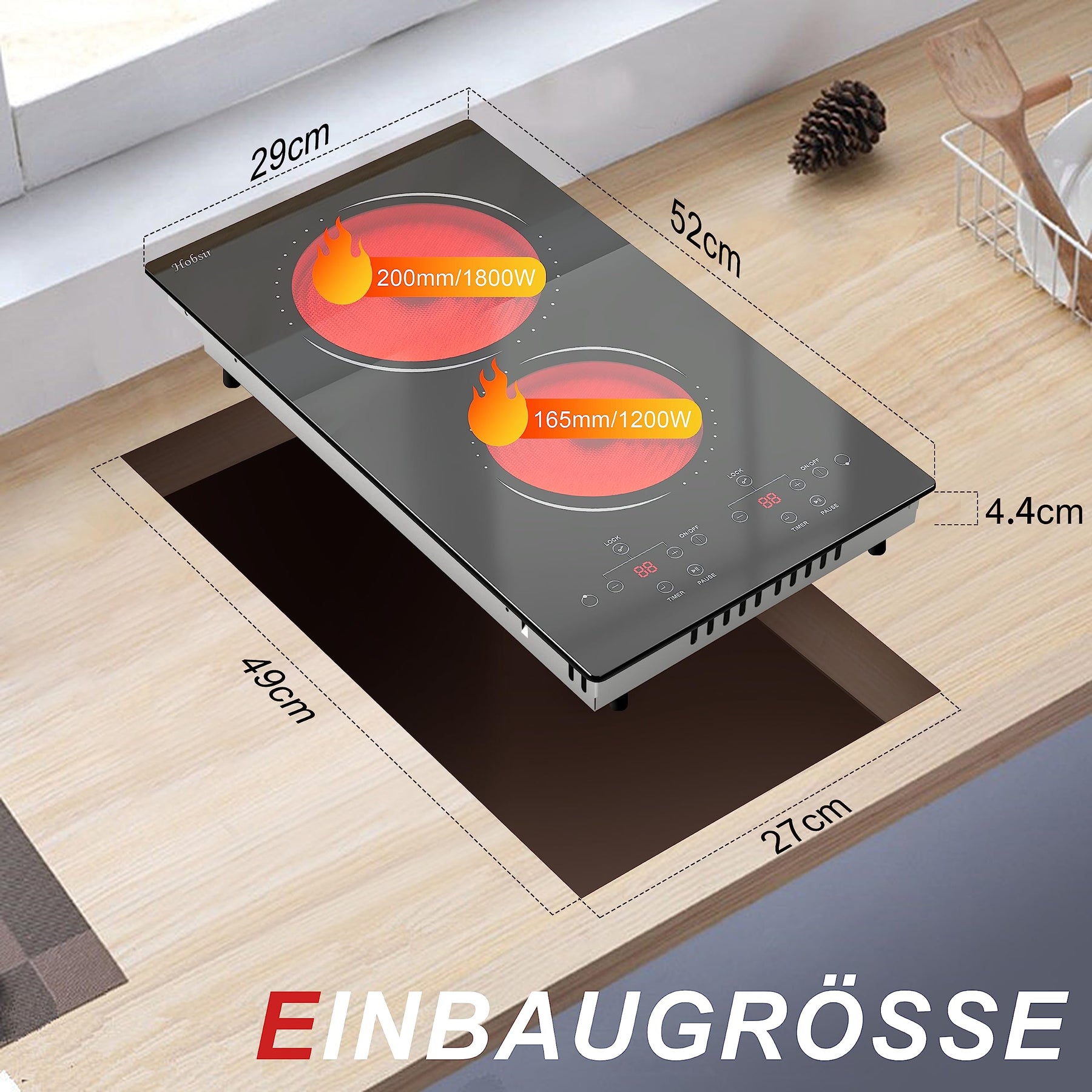 • 🔥【Eingebautes Glaskeramikkochfeld】Das eingebaute Design des Glaskeramikkochfeld 30cm ermöglicht das Kochen in einem kleineren Raum und bietet einfaches und anpassungsfähiges Kochen. Es ist ideal für kleine Küchen, Wohnungen und Wohnmobile.Produktgröße: 29*52*4.4cm (L*B*H); Eingebaute Größe: 27*49 cm. (L*B)