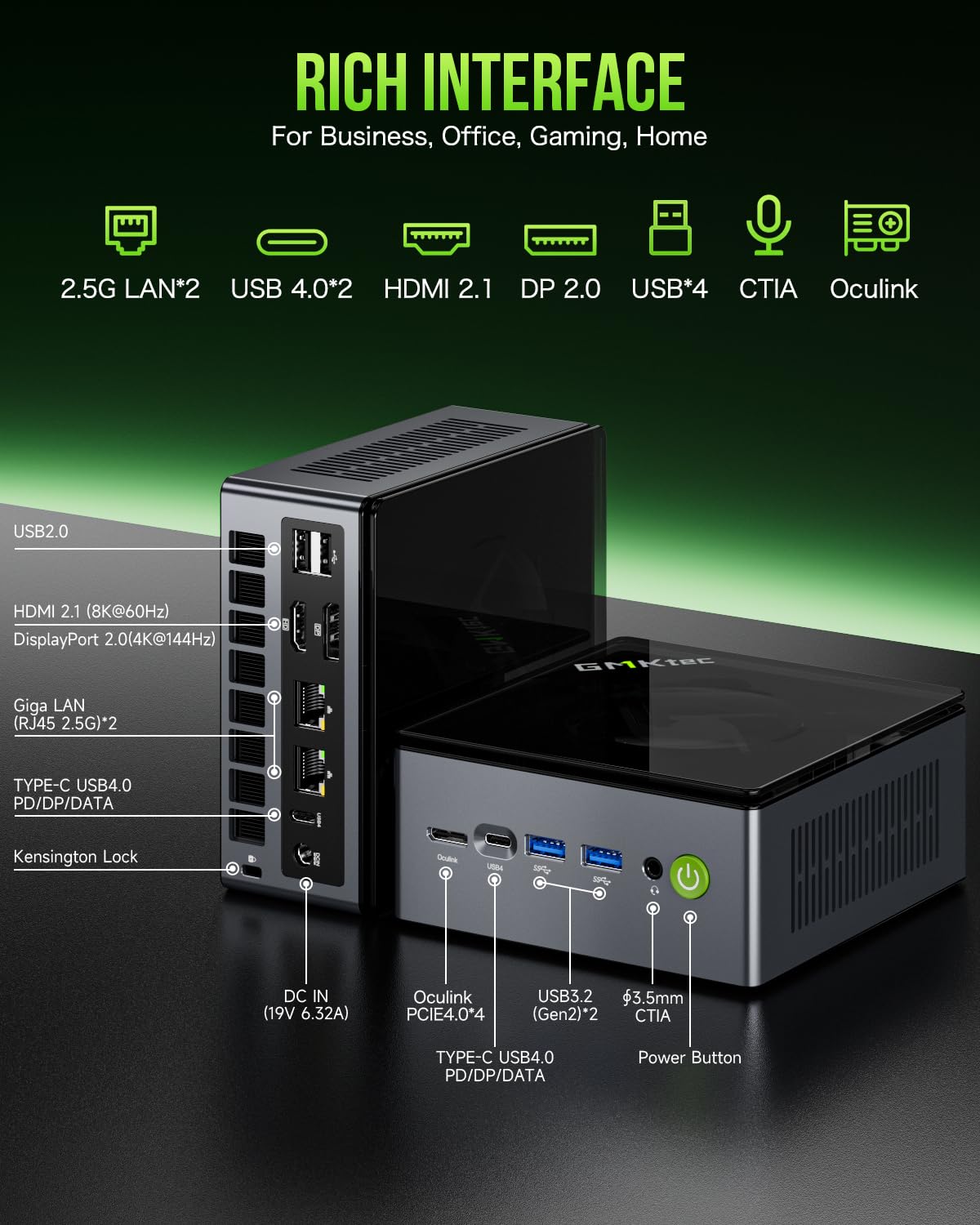 - 【Oculink-Anschluss】 Der M7 Oculink-Anschluss ermöglicht höhere Bandbreiten, bessere Bildraten und geringere Verzögerungen. Der Standard arbeitet auch mit PCIe-Geschwindigkeiten im Vergleich zu Thunderbolt x3. Gamer und Content-Ersteller können von der höheren Bandbreite von OCuLink profitieren, was zu besserer Leistung und geringerer Verzögerung für eGPU-Setups führt.