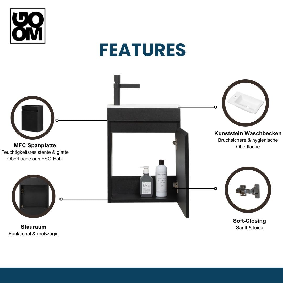 GOOM Gäste-WC Waschtisch Set 40 cm Badmöbel Vormontiert Klein Waschbecken mit Unterschrank (Schwarz)