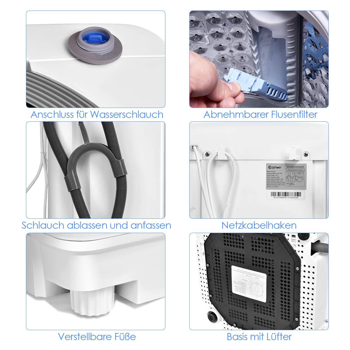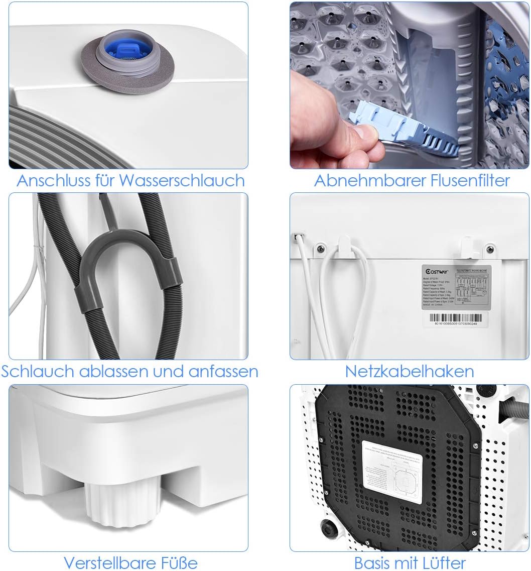 • Platzsparend mit kompaktem Design - Dank der kompakten und leichten Bauweise können Sie die Waschmaschine leicht transportieren und an jeden Ort bringen. Die unteren Füße können ebenfalls an Ihre Bedürfnisse angepasst werden. Eine gute Lösung für kleine Zimmer wie WG-Zimmer, Apartments, Wohnmobile usw.