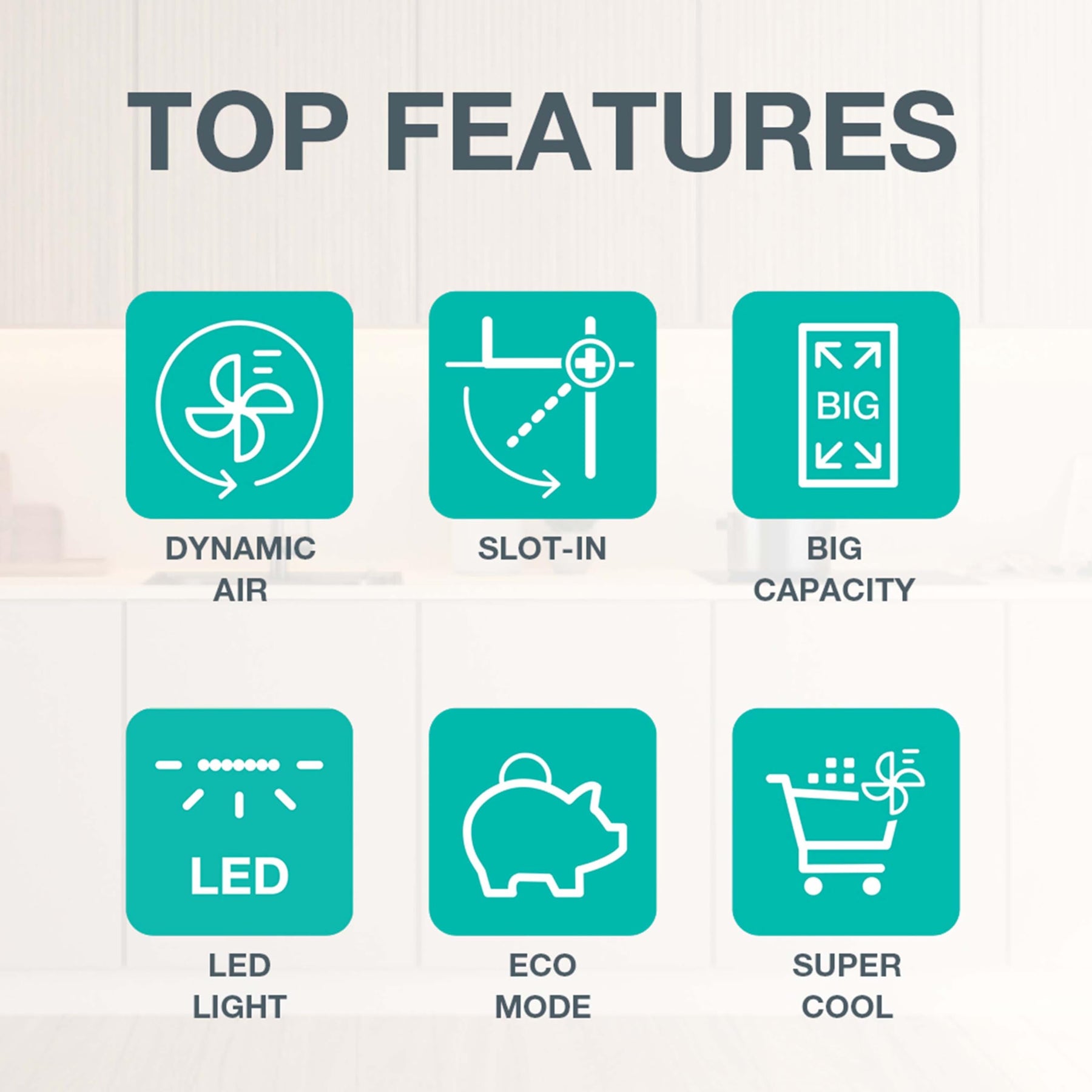 • Umluft-Kühlung mit QuickCooling-Funktion: Ein Ventilator an der Rückwand des Kühlschrankinnenraums hält die kühle Luft konstant in Bewegung und sorgt so dafür, dass sie zirkuliert. Dank der Umluftkühlung wird der gesamte Kühlschrankinnenraum stets gleichmäßig gekühlt und es bildet sich kein Kondenswasser an der Rückwand oder unterhalb der Glasablagen. Ein ideales Klima für alle Lebensmittel, die lange frisch bleiben sollen