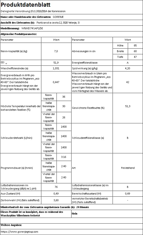Einzelheiten: Mit der Gorenje WNHEI 74 SAPS/DE Waschmaschine mit Dampffunktion waschen Sie Ihre Wäsche stets optimal. Auch größere Mengen Wäsche, bis zu 7 kg, können Sie ganz einfach mit der Gorenje WNHEI 74 SAPS/DE reinigen. Wählen Sie aus 15 unterschiedlichen Automatikprogramme Ihr ideales Waschprogramm aus. Eine zusätzliche Dampfbehandlung für weiche Wasche ohne Weichspüler nach Ende des gewählten Programms reduziert deutlich die Faltenbildung und entfernt unangenehme Gerüche sowie Bakterien. Ihre Wäsche wird perfekt sauber, hat deutlich weniger Falten und dies völlig ohne Weichspüler. Inverter PowerDrive Motor: Ein äußerst leiser, aber hocheffizienter bürstenloser Motor, der bei jedem Waschgang einen Beitrag zur Energieeinsparung leistet und gleichzeitig die Lebensdauer der Waschmaschine deutlich.