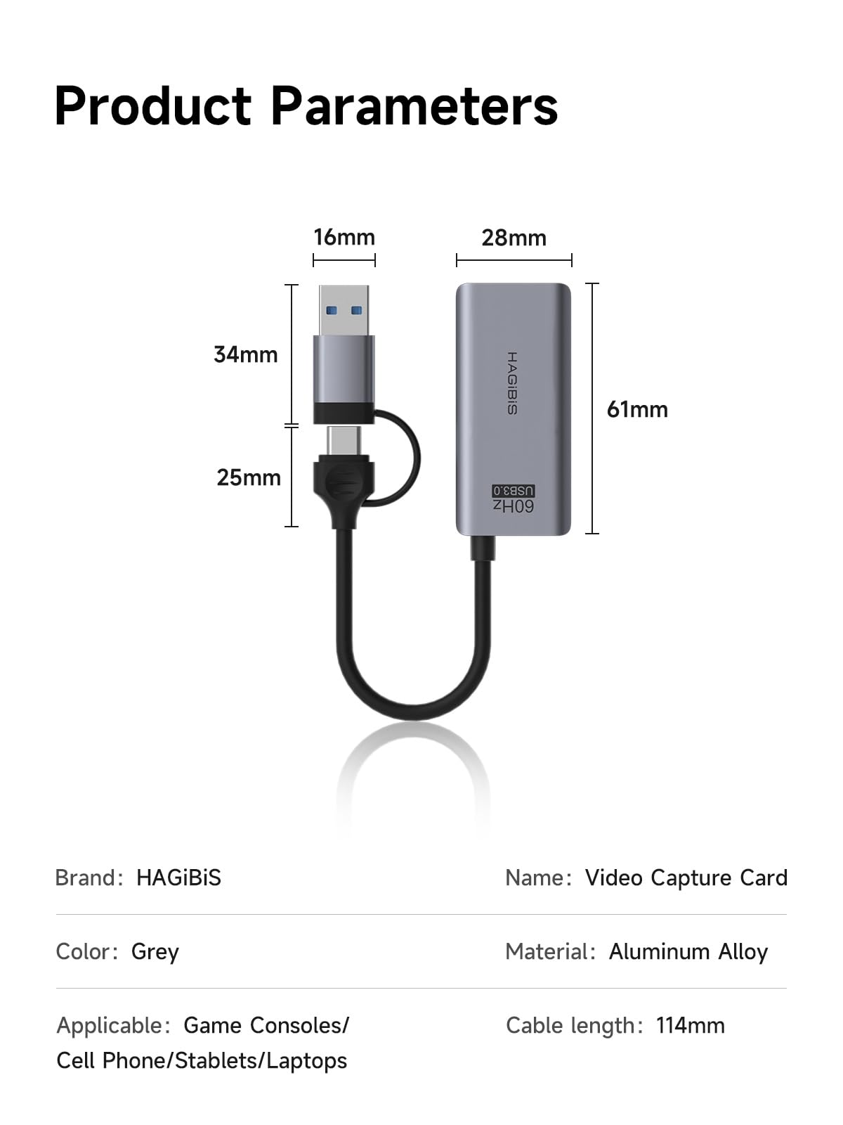 Hagibis USB 3.0 Video Capture Card HDMI to USB/USB C 1080P HD 60fps Live and Record Video Audio Game Grabber MS2130 Chip for Switch Xbox PS4/5 Live Broadcast, Gaming, Streaming hdmi Capture Card