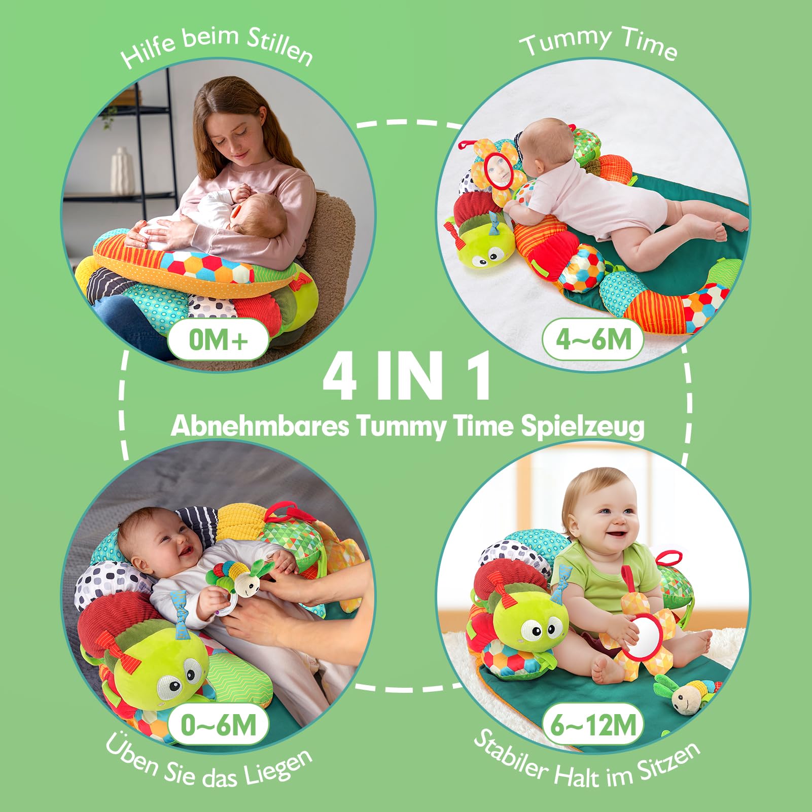 - Vielseitiges 3-in-1-Design: 🌈 hahaland Tummy Time Toys in Form einer niedlichen Raupe bietet nicht nur farbenfrohe Unterhaltung, sondern begleitet Ihr Baby auch bei wichtigen Entwicklungsschritten. Tummy time kissen mit einem stützenden C-förmigen Spielkissen, weichen stapelbaren Polstern und spannenden, leicht abnehmbaren Spielzeugen wie einem BPA-freien Beißring, einem Blumenspiegel und einer Rassel fördert es spielerisch die Entwicklung der Kopf- und Nackenmuskulatur.