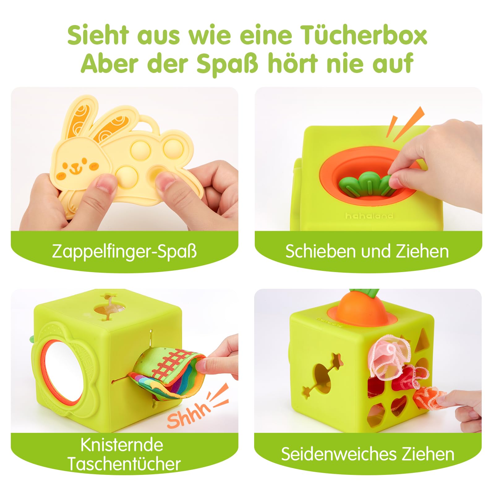- 【Pop-up Tissue Box】Baby Spielzeug ist aus hochwertigem, babysicherem Silikon hergestellt, das die Weichheit des Stoffes beibehält, aber eine festere Form hat, genau wie eine echte Ziehbox,das realistische Zieherlebnis der Taschentücher fasziniert Babys immer wieder und fördert dabei gezielt die Feinmotorik – ein perfektes babyspielzeug für kleine Hände.