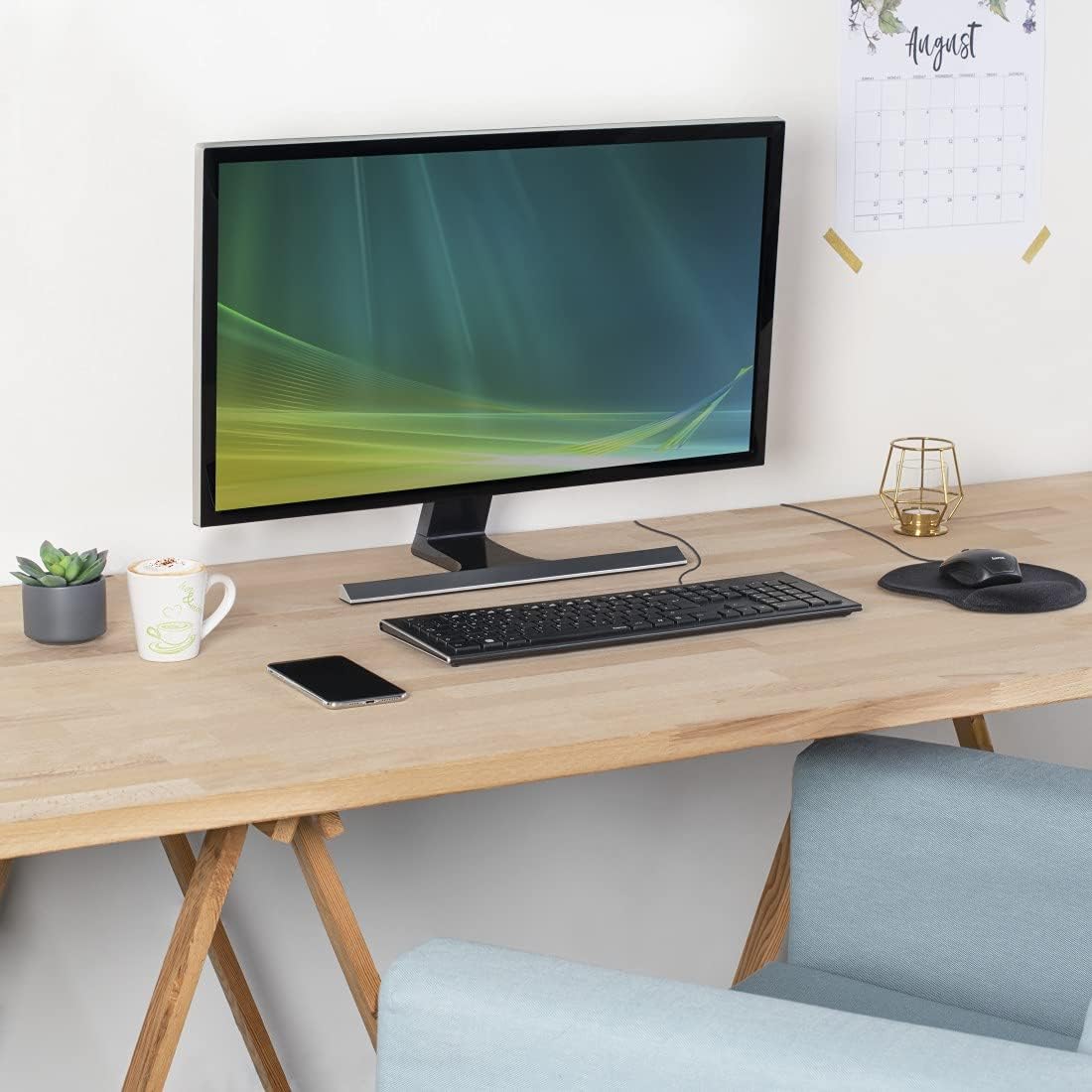 Einzelheiten: Die kabelgebundene Slim Tastatur überzeugt mit ihrem schlanken Design und den flachen, leisen Tasten mit einem weichen Anschlag. Für eine ergonomische Haltung des Handgelenks ist die Neigung der Tastatur verstellbar. Das Keyboard mit den einzeln abgesetzten Tasten lässt sich zudem besonders einfach säubern und desinfizieren. Mit der Zweitbelegung der Fn-Tasten lassen sich die Multimediafunktionen steuern – ohne dass Sie sich umständlich durch die Systemeinstellungen klicken müssen. Und dank Vollformat mit Ziffernblock ist bei der QWERTZ Tastatur alles dabei. Die optische Computermaus ist mit einem hochauflösenden 1000-dpi-Sensor ausgestattet. Dadurch lässt sich der Mauszeiger besonders genau und fließend steuern. Die kabelgebundene Tastatur und Maus funktionieren mit Plug & Play, es muss keine zusätzliche Software installiert werden. Das Tastatur-Maus-Set ist konzipiert für Windows 11/10/8/7/Vista.