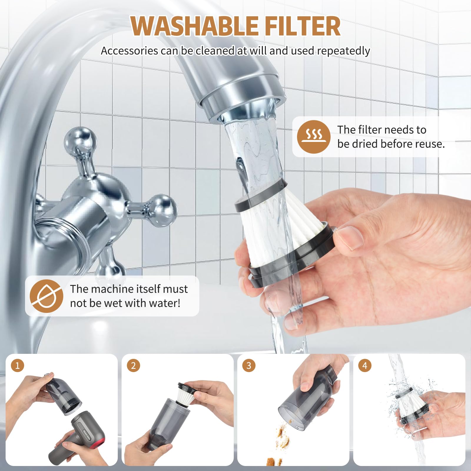 - 🎁【Ergonomisches Design und waschbarer Filter】- Der kabellose Handstaubsauger hat ein ergonomisches, strukturiertes Griffdesign, das einen bequemen Griff bietet. Einfach zu montieren und abnehmbar. Der HEPA-Filter ist waschbar, aber nach dem Waschen muss er getrocknet werden, bevor er in die Staubsammelhaube eingesetzt wird. Eine regelmäßige Reinigung des waschbaren Filters kann Saugverluste und Verstopfungen verhindern und eine gute Saugleistung aufrechterhalten.