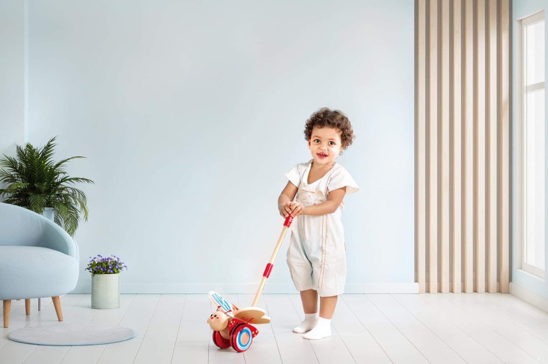 Durch leichtes Schieben oder Ziehen flattert der Schmetterling mit den Flügeln und bringt das Kind dabei ganz schön auf Trab. Üben Sie dabei mit Ihrem Kind, schneller/langsamer oder vorwärts/rückwärts zu gehen.