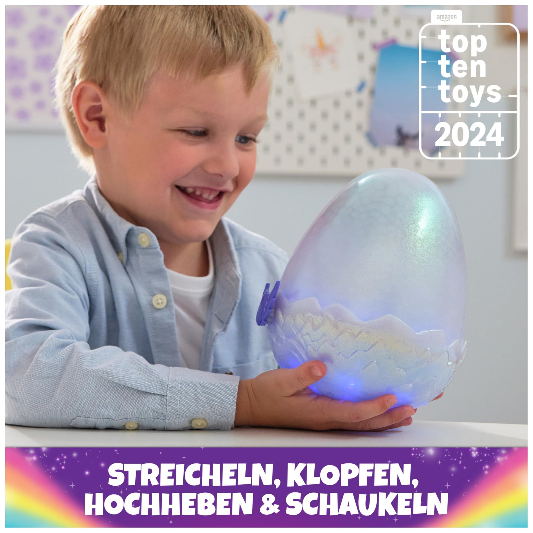 Mit den Hatchimals Alive Mystery Eiern erleben Kinder die Magie einer Geburt. Alles beginnt damit, die Flügel ins Ei zu stecken, um es zu aktivieren. Dann leuchtet es von innen heraus, erste Geräusche erklingen und man merkt: Da rührt sich was. Jetzt muss das Ei behutsam gestreichelt, geschaukelt und hochgehoben werden, damit der Schlüpfprozess angestoßen wird. Einfach an die Schale klopfen, schon klopft das Hatchimals zurück. Wenn das Ei in den Farben des Regenbogens leuchtet, hat es genug Liebe bekommen und das Hatchimals pickt sich langsam aus der Eierschale heraus. Geheimnisvoller Nebel erhöht dabei die Spannung. Wer letztlich schlüpft, bleibt bis zum Schluss ein Geheimnis. Auf jeden Fall eines von zwei coolen Plüschdrachen, die den Elementen Feuer oder Wasser zugeordnet sind. Nach dem Schlüpfen dient der untere Teil des Eies als Nest, in dem sich das Hatchimals selbst in den Schlaf singt oder Guck-Guck spielt. Natürlich erst, wenn es gefüttert wurde, Bäuerchen gemacht oder gepupst hat und sich mit Fliegen und Tanzen verausgabt hat. Mit etwas Hilfe lernt es, Sätze nachzusprechen. Mit ihrem Hatchimals können Kinder immer wieder in fantasievolles Rollenspiel eintauchen. Neben den Hatchimals Alive Mystery Ei mit Draggle gibt es auch eine Pufficorn-Variante mit schimmerndem Horn.