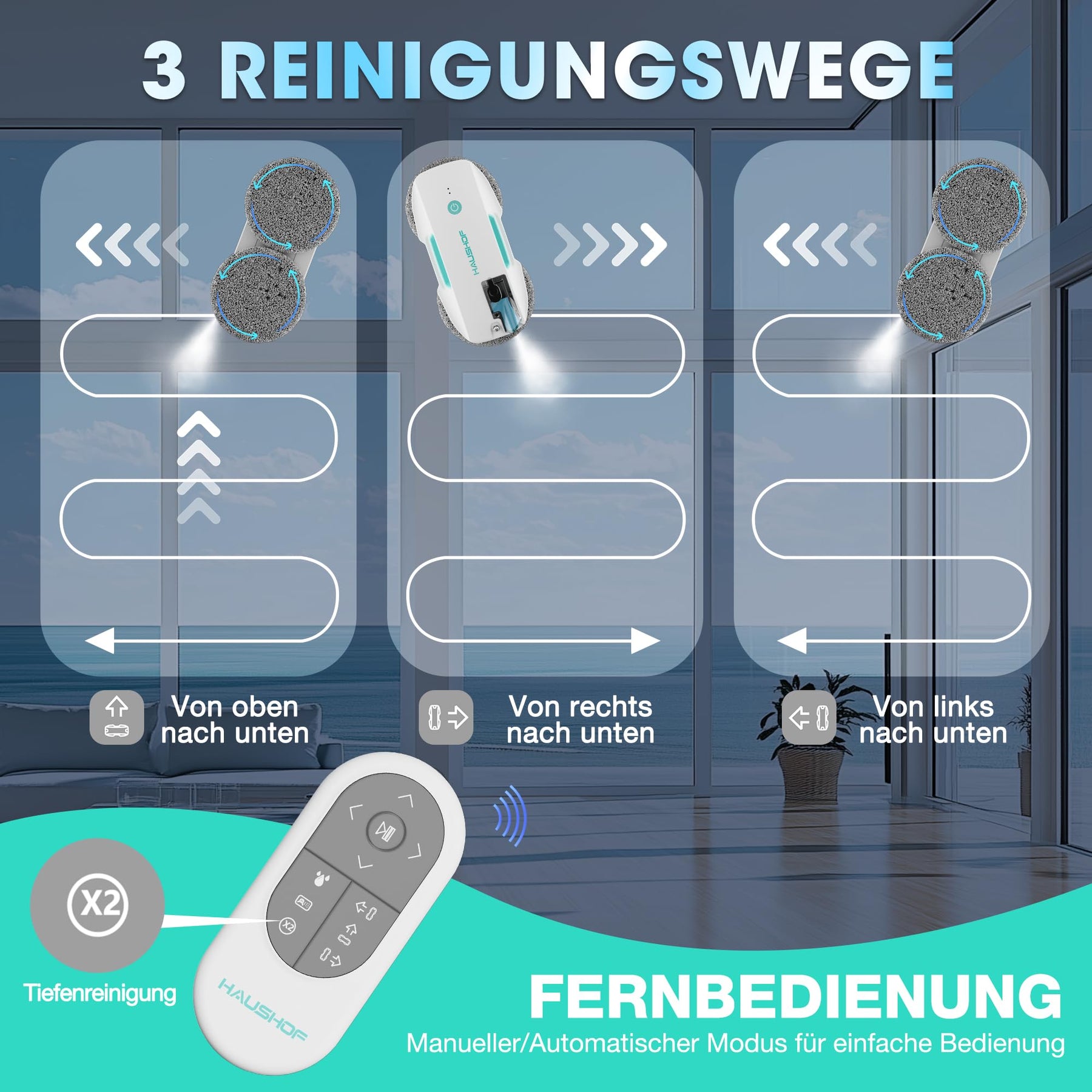 - Effiziente Reinigung: Drücken Sie einfach einen Knopf zum Starten, der Roboter reinigt automatisch oder kann auch per Fernbedienung gesteuert werden. Ausgestattet mit leistungsstarken bürstenlosen Motor, Saugleistung bis zu 3800 Pa, geeignet für die meisten glatten Oberflächen, wie Glasfenster, Spiegel, große Fliesen, Marmor Arbeitsplatten, Glastüren, etc.Tipp: Wenn die Reinigungswirkung nachlässt, ersetzen oder waschen Sie das Reinigungstuch rechtzeitig.