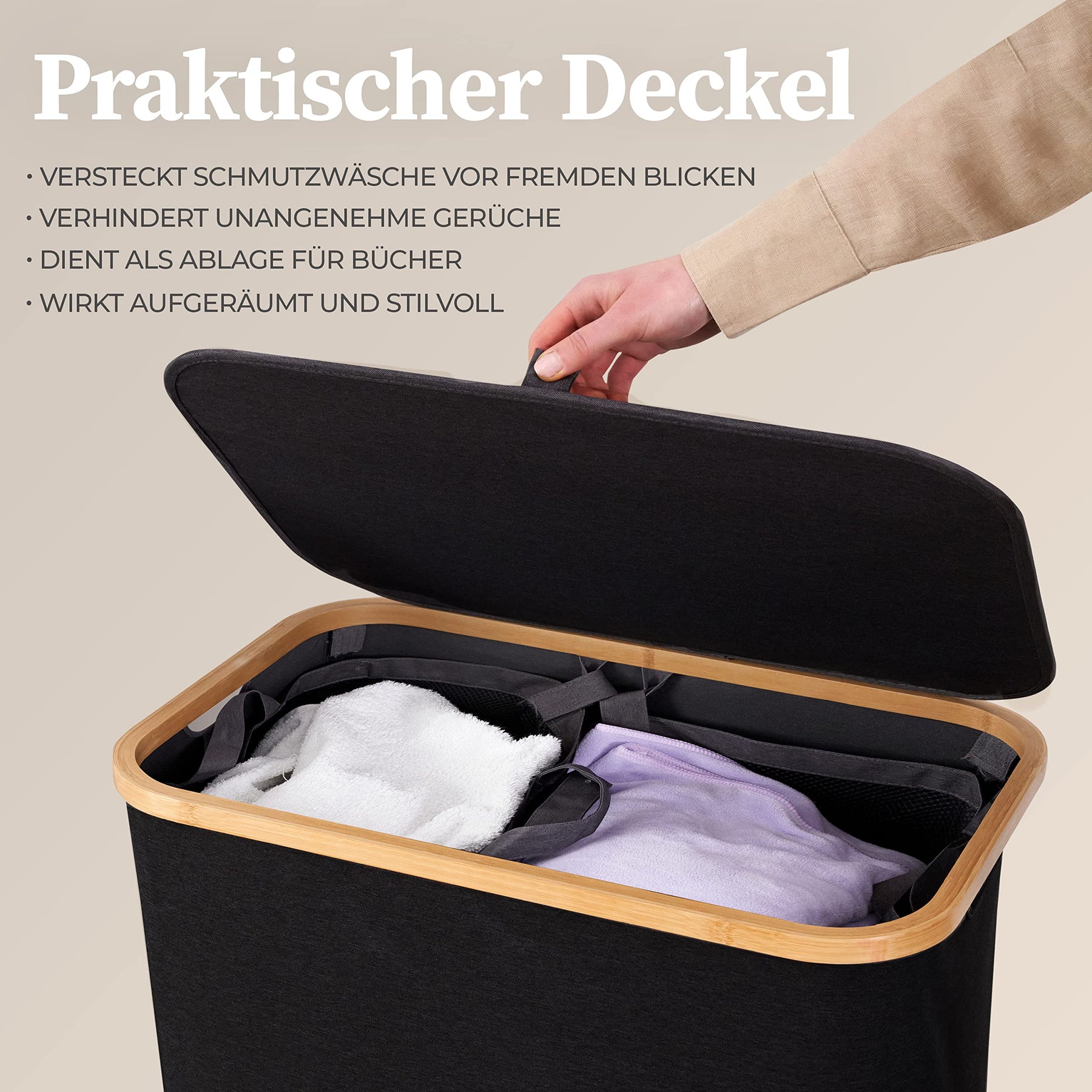 - MUST-HAVE FÜR DEIN ZUHAUSE: Der Waschkorb wirkt dank dem Stoff Design in schwarz mit Bambus Applikation modern elegant - absoluter stylischer Hingucker im Bad, Schlafzimmer, Kinderzimmer oder Wohnzimmer. Blickfang mit großer Wäschebehälter Aufbewahrung in Schwarz
