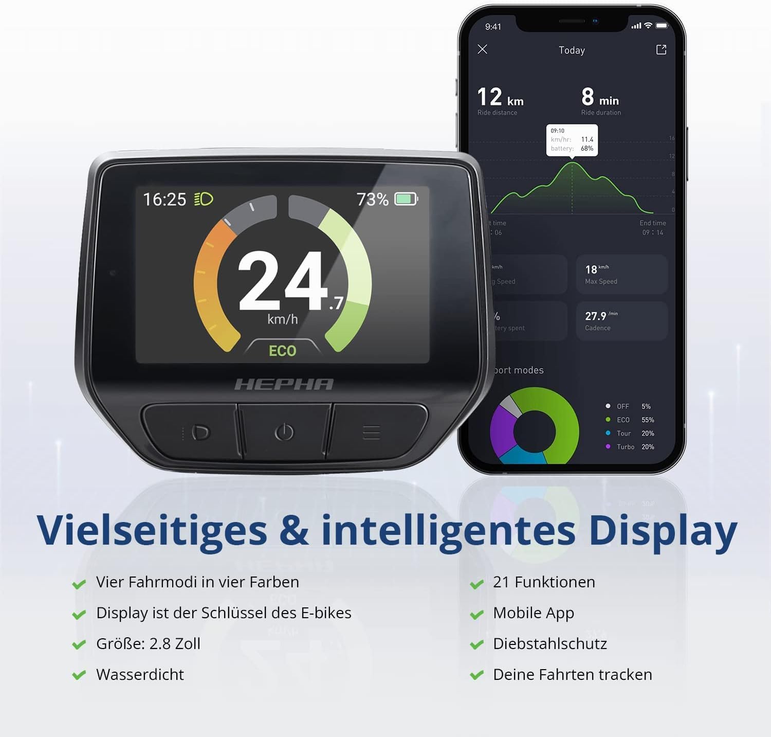 - 🚴 Intelligentes Farbdisplay: 2,8 Zoll, wasserdicht. Hepha Display hat insgesamt 21 Funktionen. Jede Unterstützungseinstellung (Eco, Tour, Turbo und Walk)hat ihre eigene Farbe. Das Display ist der Schlüssel zu Ihrem E-bike, entfernen Sie das Display und der Motor wird automatisch deaktiviert. Sie können auch Ihre Einstellungen mit Hepha App drahtlos anpassen.