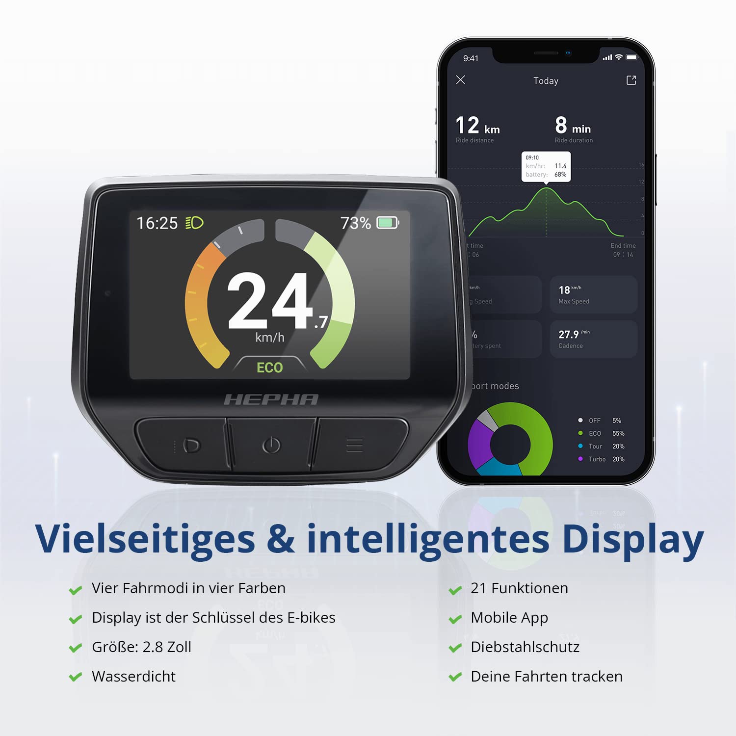 - 🚵 Intelligentes Farbdisplay: 2,8 Zoll, wasserdicht. Hepha Display hat insgesamt 21 Funktionen. Jede Unterstützungseinstellung (Eco, Tour, Turbo und Walk)hat ihre eigene Farbe. Das Display ist der Schlüssel zu Ihrem E-bike, entfernen Sie das Display und der Motor wird automatisch deaktiviert. Sie können auch Ihre Einstellungen mit Hepha App drahtlos anpassen.
