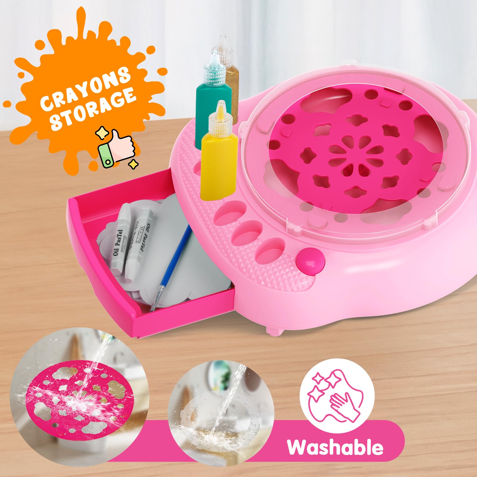- Bildungsspaß: Während des Spielens ist diese drehende Kunstmaschine eine fantastische Möglichkeit für Kinder, etwas über Farbmischung und die Physik der Bewegung zu lernen. Verwenden Sie den weißen Wachsmalstift und den Pinsel für Spezialeffekte, wählen Sie aus 7 lebendigen und metallischen Farben und lassen Sie der Fantasie Ihrer Kinder freien Lauf