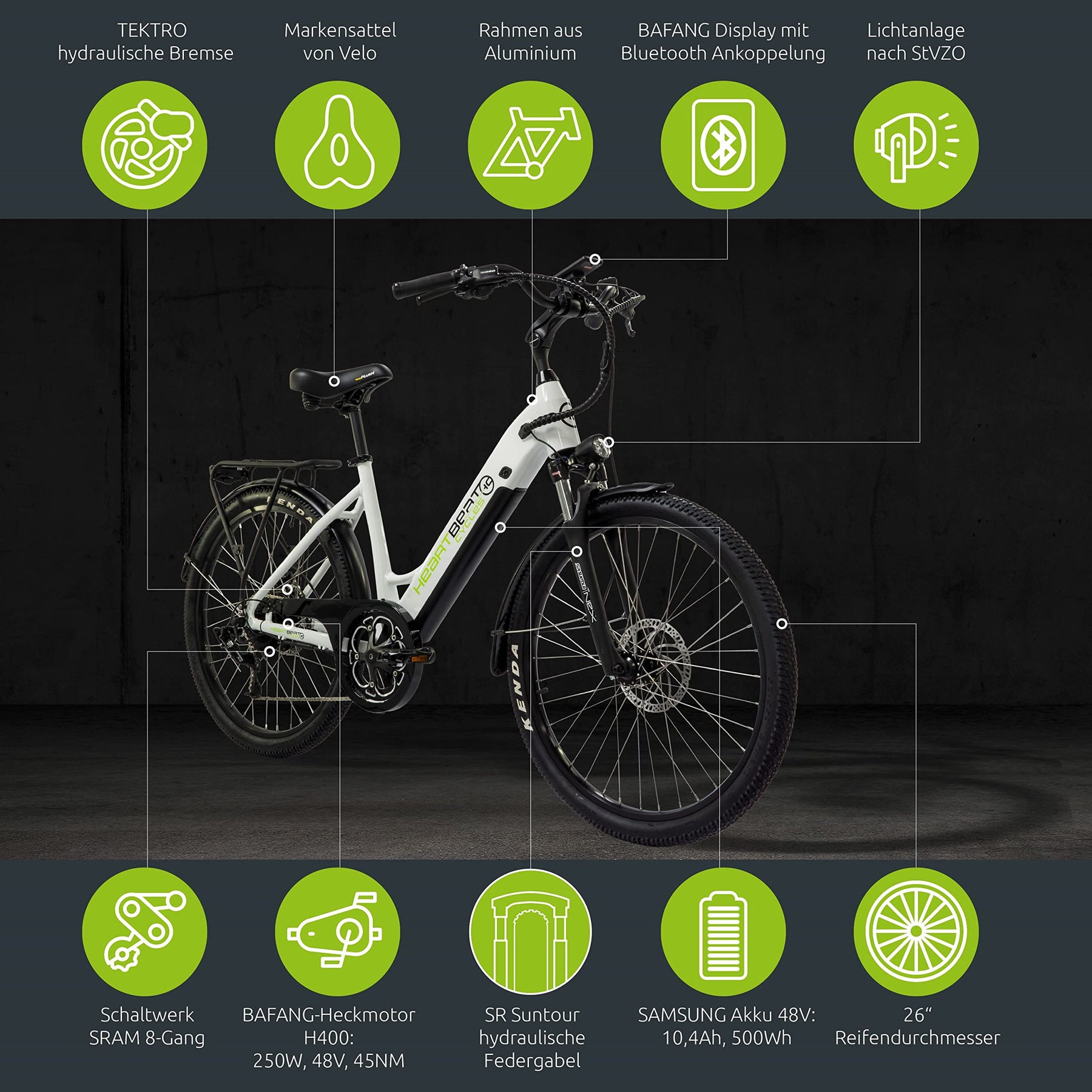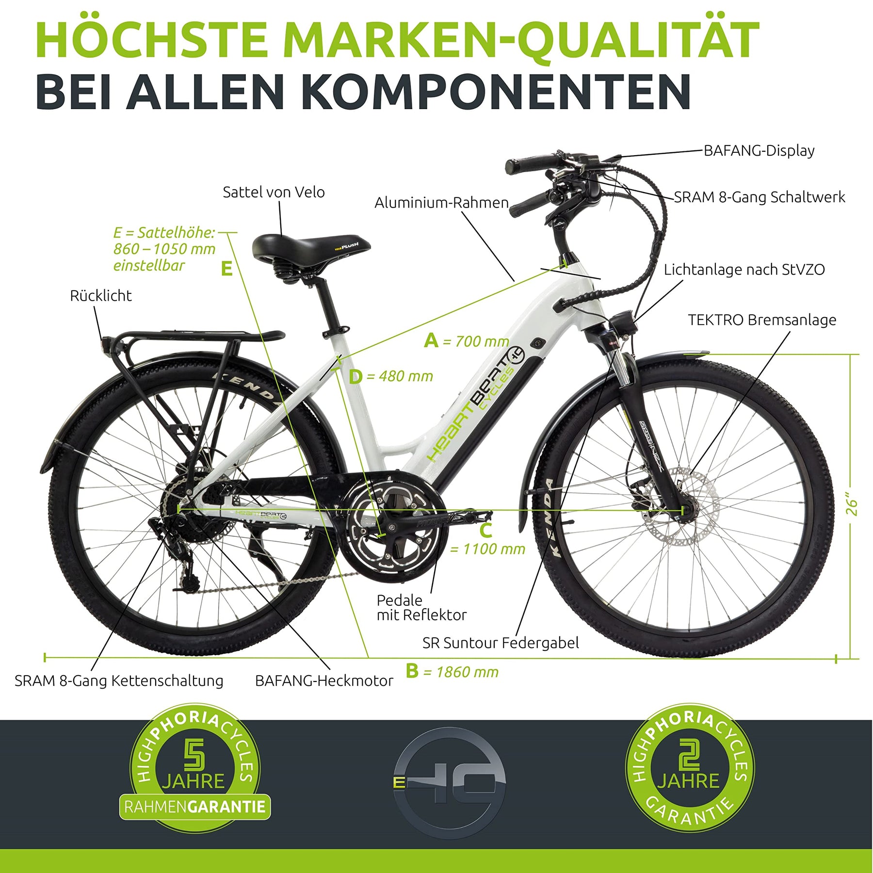 • High-End-Konfiguration – Die im Fahrrad verwendete Konfiguration ist geeignet für BAFANG-Antrieb und -Motor, Schaltwerk für SRAM (8-Gang), starker Aluminiumrahmen für HIGHPHORIA, Bremsen für TEKTRO, langlebiger Akku für SAMSUNG, 8-Gang-Fahrradkette für KMC, hydraulisch gefederte Vorderradgabel für SR Suntour, Reifen für KENDA, Display für BAFANG mit USB-Anschluss, Bluetooth und Bafang Go App.