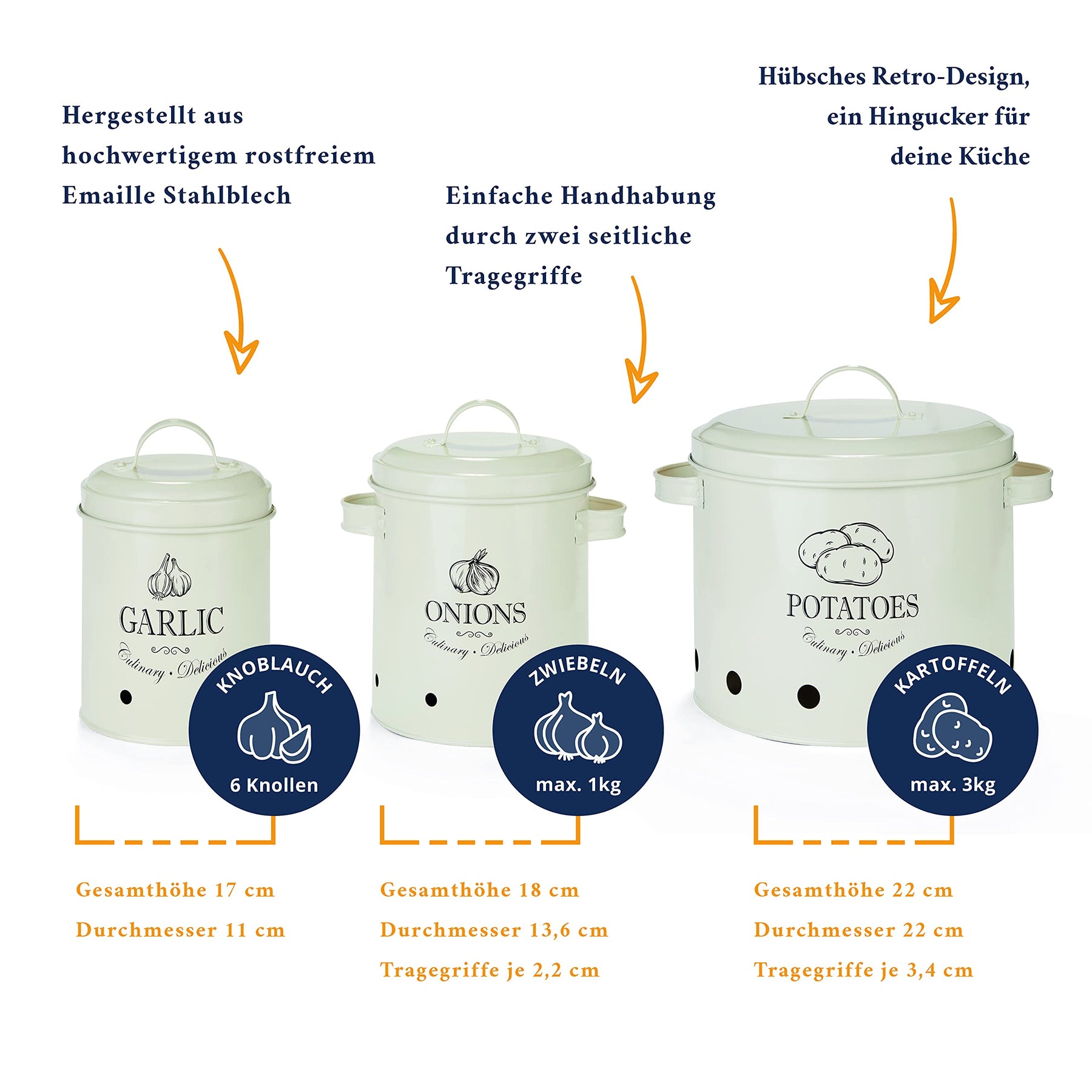 • ✅SAUBERKEIT IN DER KÜCHE: Schluss mit Dreck, Krümeln und Schalenresten auf der Arbeitsplatte! Mit unseren stilvollen Vorratsdosen herrscht mehr Ordnung in der Küche, während der Schmutz dort bleibt, wo er hingehört. Der perfekte Kartoffel-, Knoblauch- und Zwiebel-Behälter.