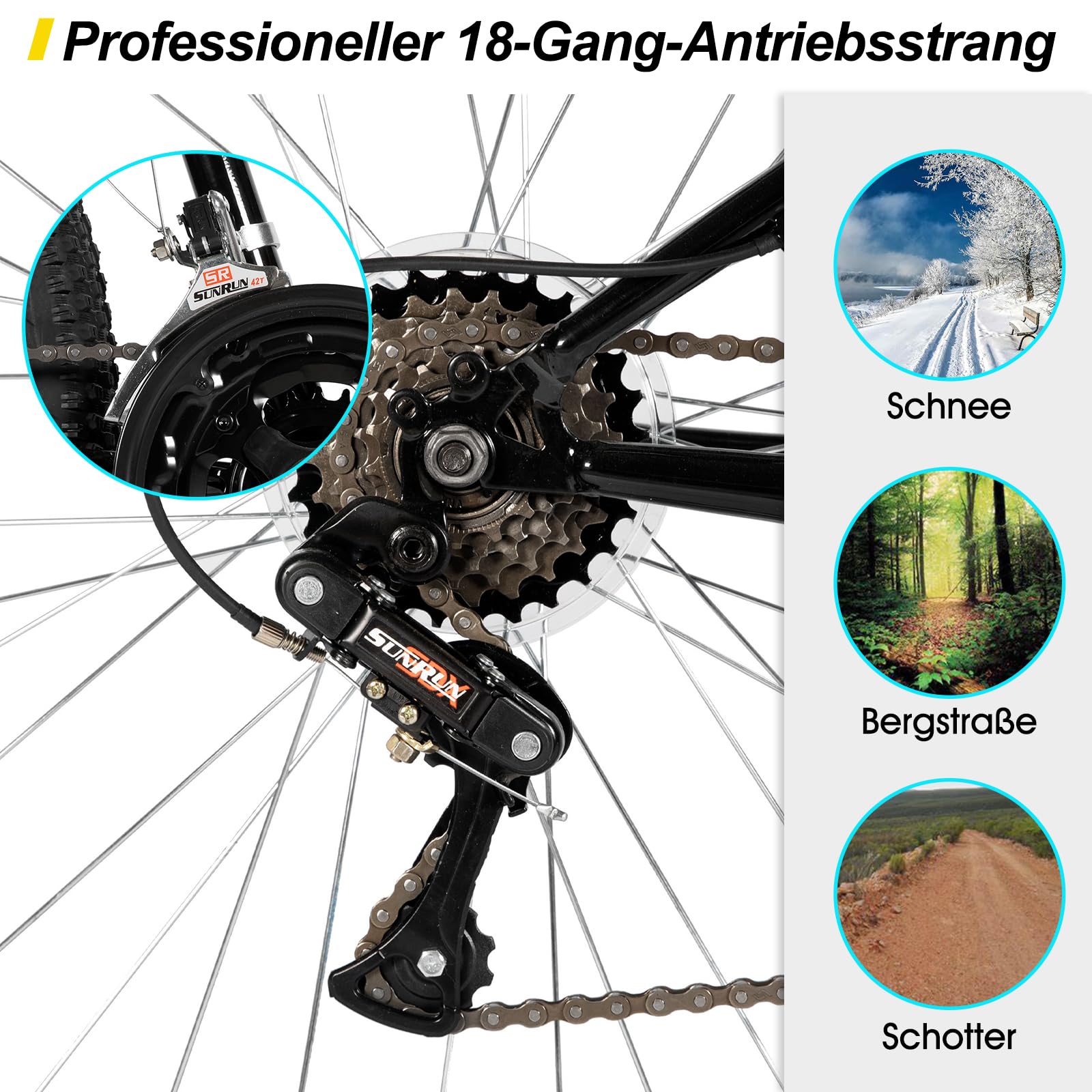• Präzise 18-Gang-Schaltung: Die zuverlässige 18-Gang-Schaltung ermöglicht eine sanfte und präzise Anpassung an unterschiedliche Geländearten, sei es auf Hügeln oder geraden Strecken.
