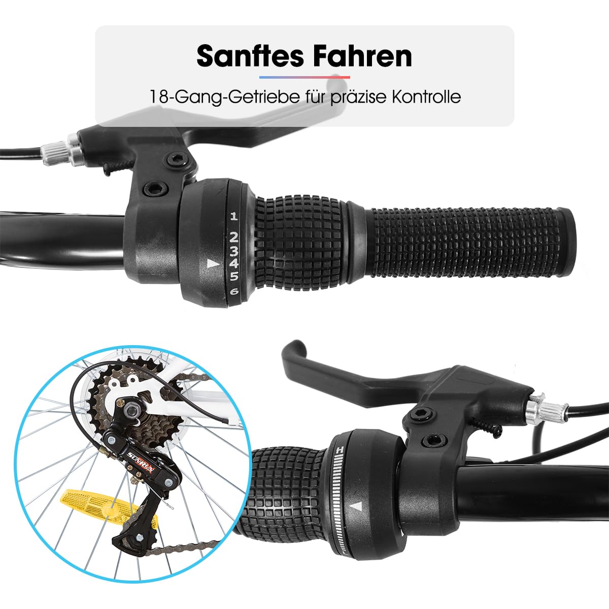 • 18-Gang-Schaltung für vielseitige Fahrten – Die präzise 18-Gang-Schaltung ermöglicht eine einfache Anpassung an unterschiedliche Straßen- und Geländeverhältnisse.