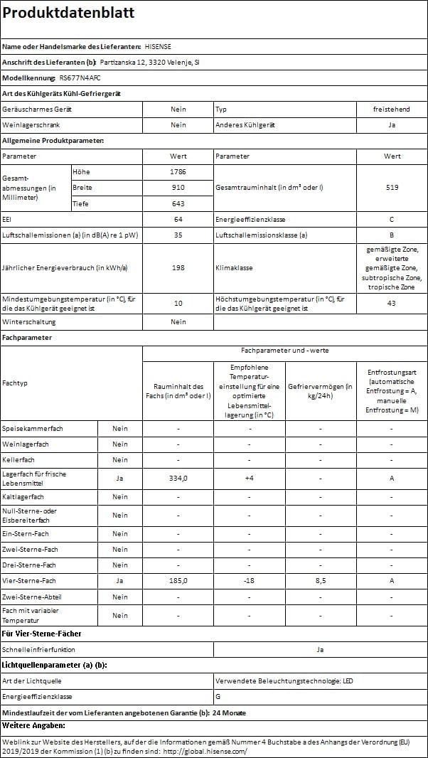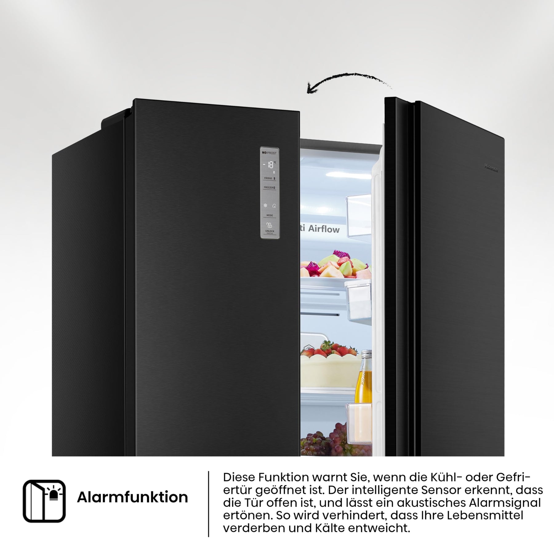 Einzelheiten: Mit der Hisense RS677N4AFC Side by Side Kühl – Gefrier – Kombination können Sie Ihre Lebensmittel optimal lagern. Übernehmen Sie die vollständige Kontrolle über die Funktionen Ihres Kühlschranks mit einem übersichtlichen, leicht erreichbaren und benutzerfreundlichen LED-Touch-Bedienfeld, mit dem Sie schnell die gewünschte Temperatur für jedes Fach auswählen können. Multi-Air-Flow: Durch das innovative Multi-Air-Flow-System wird die kalte Luft in Ihrem Kühlschrank gleichmäßig verteilt, was die optimale Temperatur in Ihrem Kühl- und Gefrierschrank konstant hält. So wird Ihr Essen überall perfekt gekühlt, egal, wo es platziert wird. Inverter Kompressor: Moderne Inverter Kompressoren messen die Bedingungen in Ihrem Kühlschrank und passen die Kühlleistung entsprechend an, um die Temperatur zu stabilisieren, Energie zu sparen, leiser zu laufen und die Lebensdauer des Geräts zu verlängern. Türalarm: Der intelligente Sensor erkennt, wenn Sie Ihre Kühlschrank- oder Gefrierschranktür offen gelassen haben. Er lässt ein akustisches Tonsignal ertönen, um zu verhindern, dass Lebensmittel verderben. Streamline-Metallgriff: Der Griff dieser Produktreihe hat ein neues Design, das ihn wie eine einzelne Linie aussehen lässt. So können Sie den Griff Ihres Kühlschranks noch einfacher erreichen und noch besser und leichter reinigen.