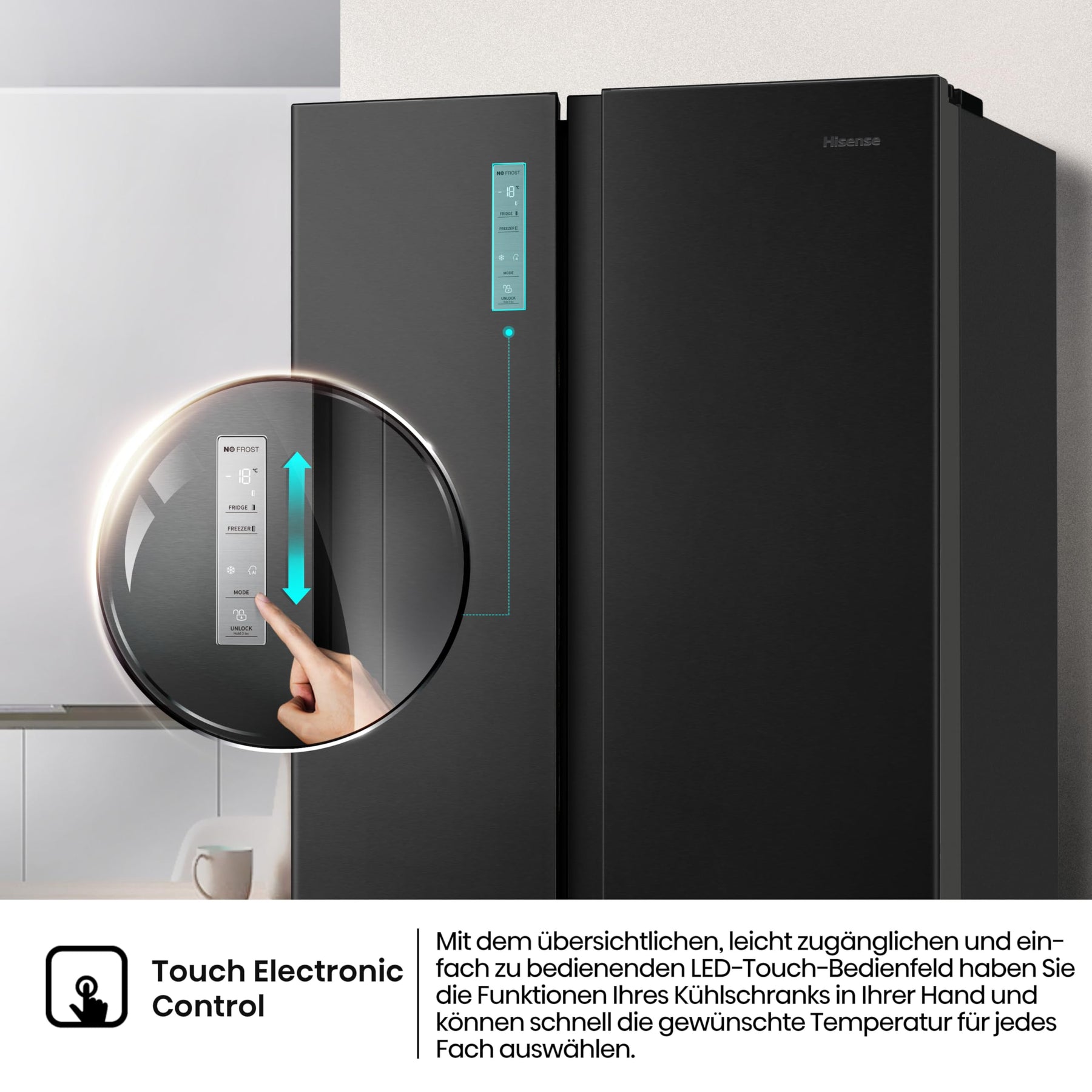 • Electronic Touch Control: Übernehmen Sie die vollständige Kontrolle über die Funktionen Ihres Kühlschranks mit einem übersichtlichen, leicht erreichbaren und benutzerfreundlichen LED-Touch-Bedienfeld, mit dem Sie schnell die gewünschte Temperatur für jedes Fach auswählen können