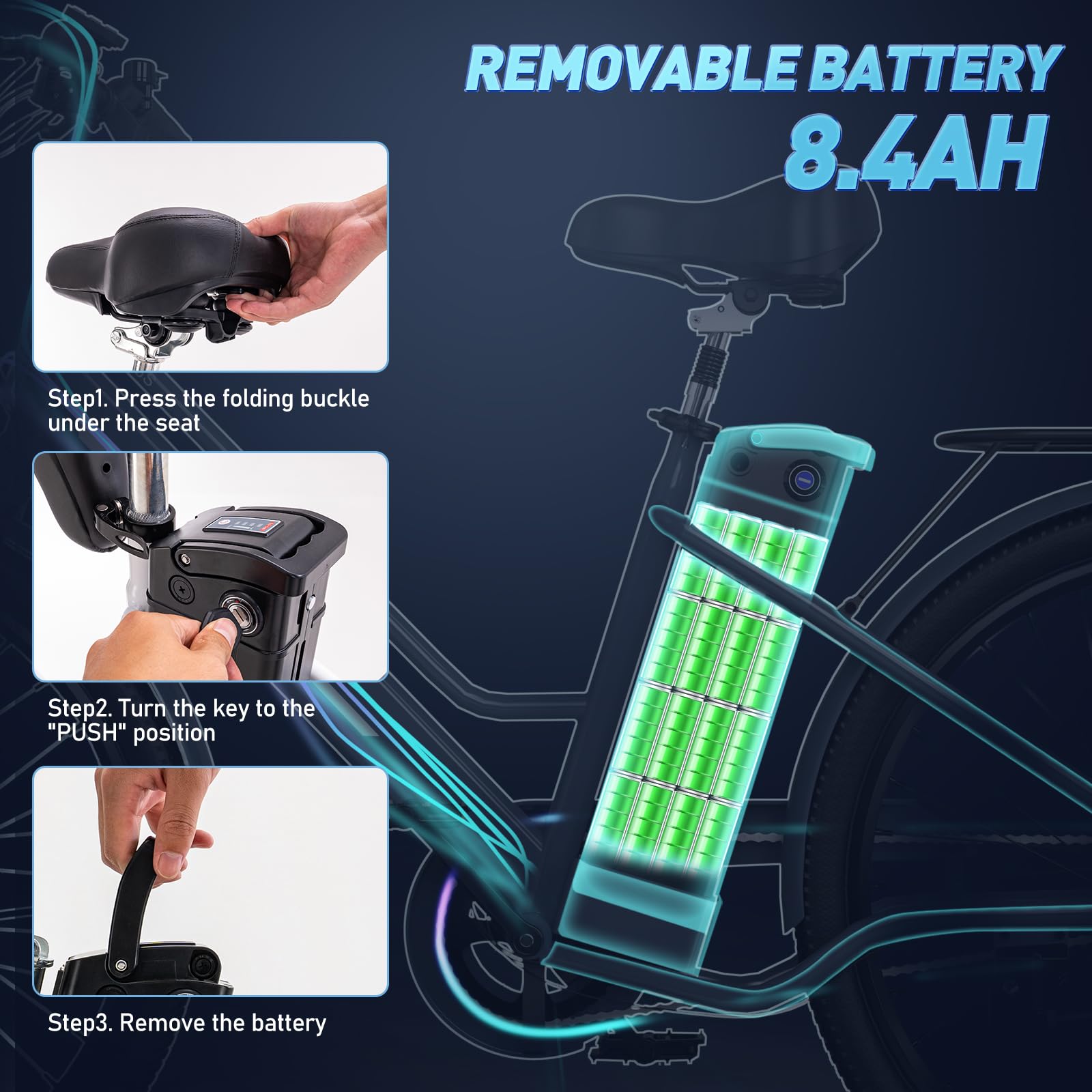 【ABNEHMBARER AKKU】: Der 36 V/8.4 Ah Lithium-Akku hat ein abnehmbares Design, das den Akku separat aufladen kann und leicht zu tragen ist. Dem Akku liegt eine separate mechanische Diebstahlsicherung mit Akkuschlüssel bei. Die maximale Geschwindigkeit kann 25 km/h erreichen und die maximale Reichweite kann 35-70 km (abhängig von Fahrweise, Gewicht, Straßenzustand, Wind usw.) erreichen. Die Ladedauer beträgt 3 bis 6 Stunden.