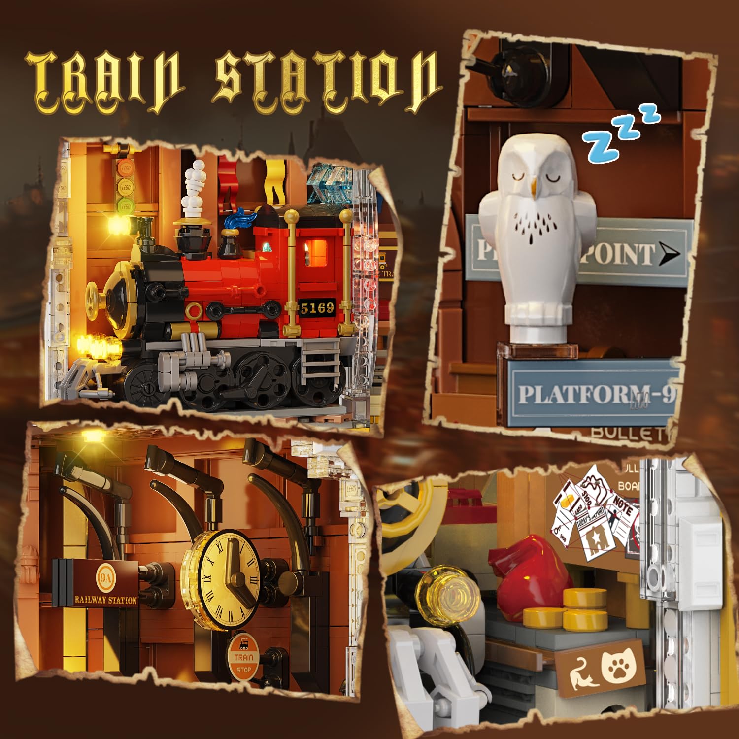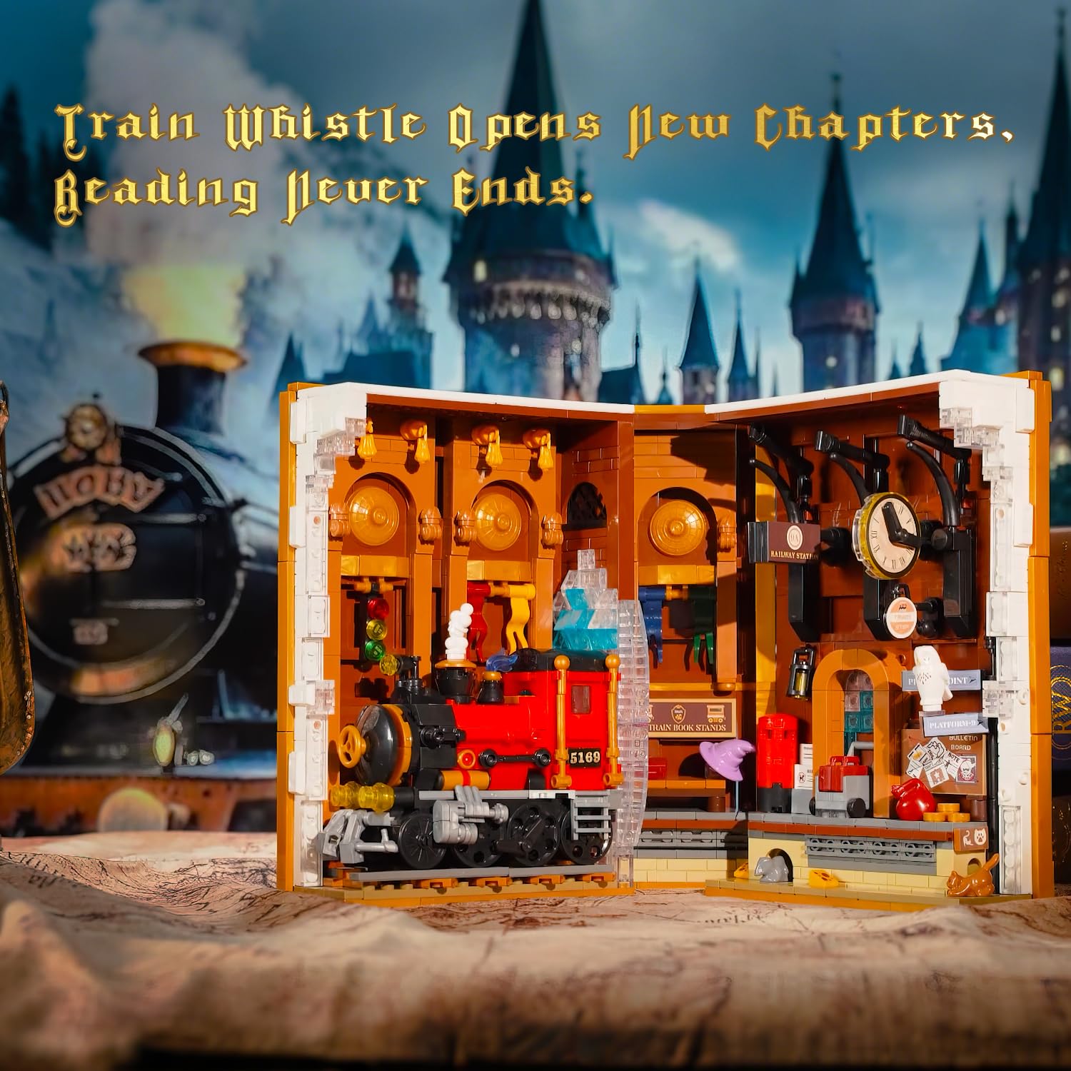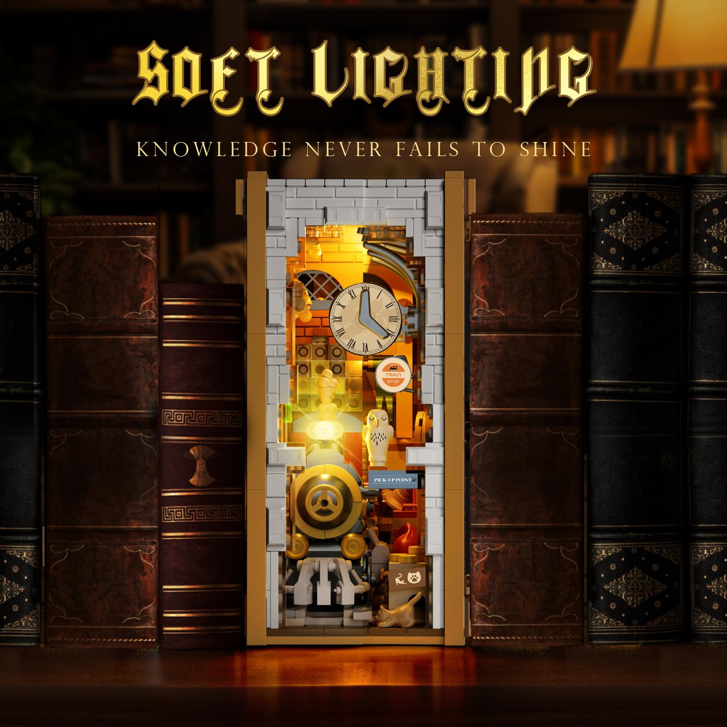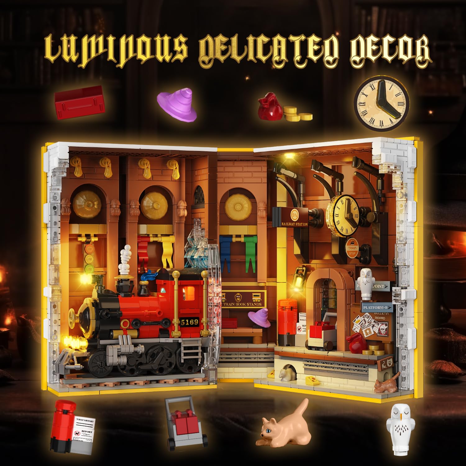 HOGOKIDS Magischer Bahnhof Book Nook Bauspielzeug Set mit LED, 1300 Pcs Buchstützen-Bausteinsatz für Bücherregal, Heimdekoration, DIY Booknook Geschenke für Erwachsene, Jungen Mädchen ab 10 Jahren