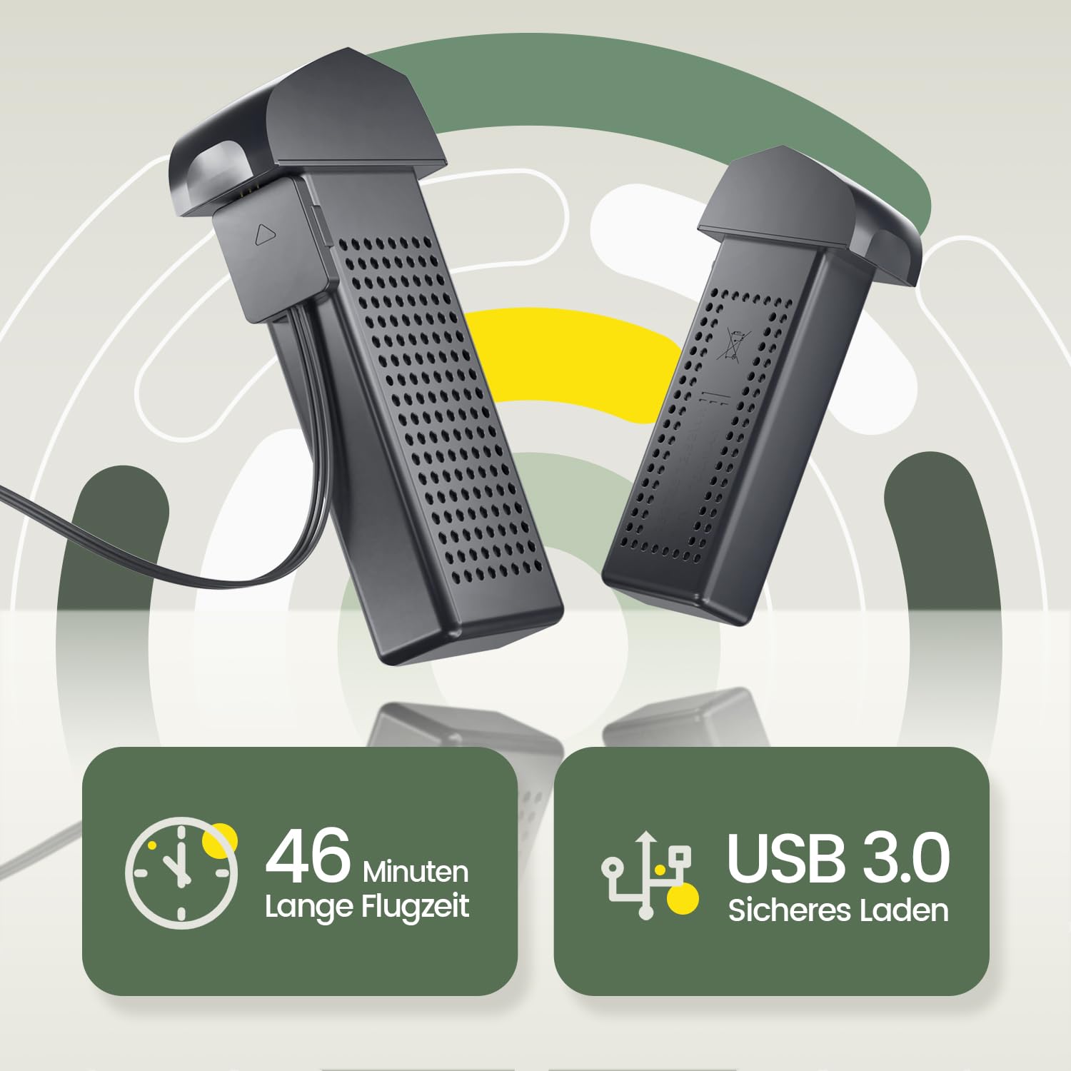 - 𝐊𝐫𝐚𝐟𝐭𝐯𝐨𝐥𝐥 𝐮𝐧𝐝 𝐋𝐚𝐧𝐠𝐚𝐧𝐡𝐚𝐥𝐭𝐞𝐧𝐝: Bürstenlose Motoren treiben die Propeller leistungsstark an und ermöglichen einen stabilen und leisen Flug wie ein Kolibri. Derweil verlängern zwei Akkus die Flugzeit auf 46 Minuten. Auch die passende Aufbewahrungsbox wird mitgeliefert. Eine ideale Wahl für Liebhaber der Outdoor-Fotografie.