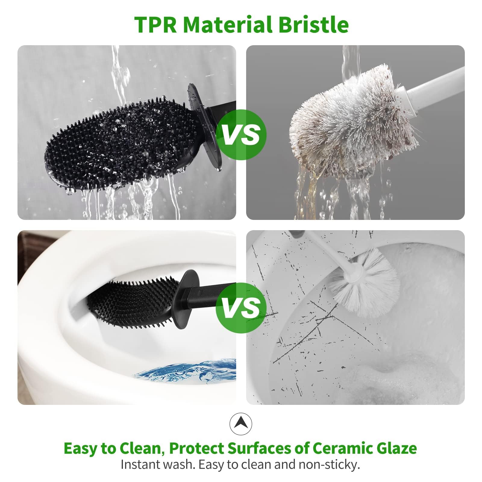 - Silikon-Bürste: Die Borsten bestehen aus weichem TPR-Material, sind durch ihre Flexibilität besser zu handhaben und diese flachen Borsten passen sich besser an den unteren gebogenen Bereich der Toilette an. Es wird die Toilette nicht beschädigen oder Schmutz ansammeln. Die Silikon-Toilettenbürste nutzt sich nie ab und verändert ihre Formen, sie kann eine perfekte Reinigung aufrechterhalten.