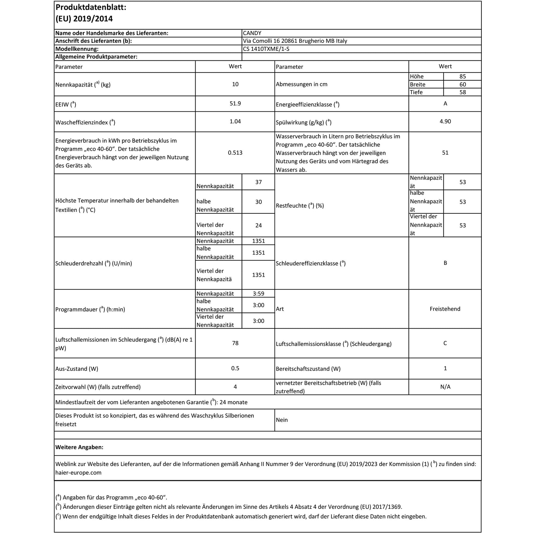 Einzelheiten: Candy Smart Inverter CS 1410TXME/1-S Waschmaschine / 10 kg / Smarte Bedienung mit NFC-Technologie / Inverter-Motor / Symbolblende / minutengenaue Restlaufzeitanzeige