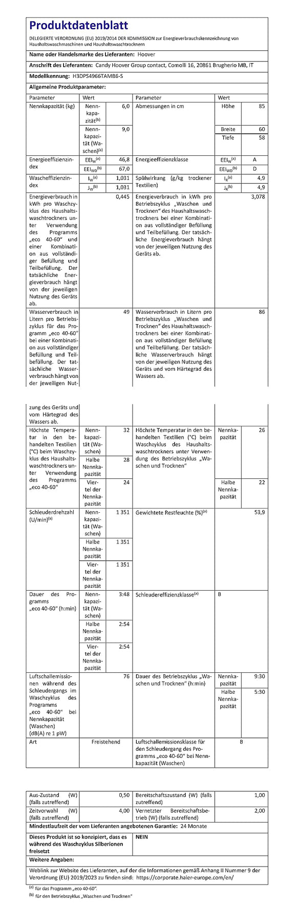 Einzelheiten: Hoover WASCHTROCKNER H-WASH 350 H3DPS4966TAMB6-S
