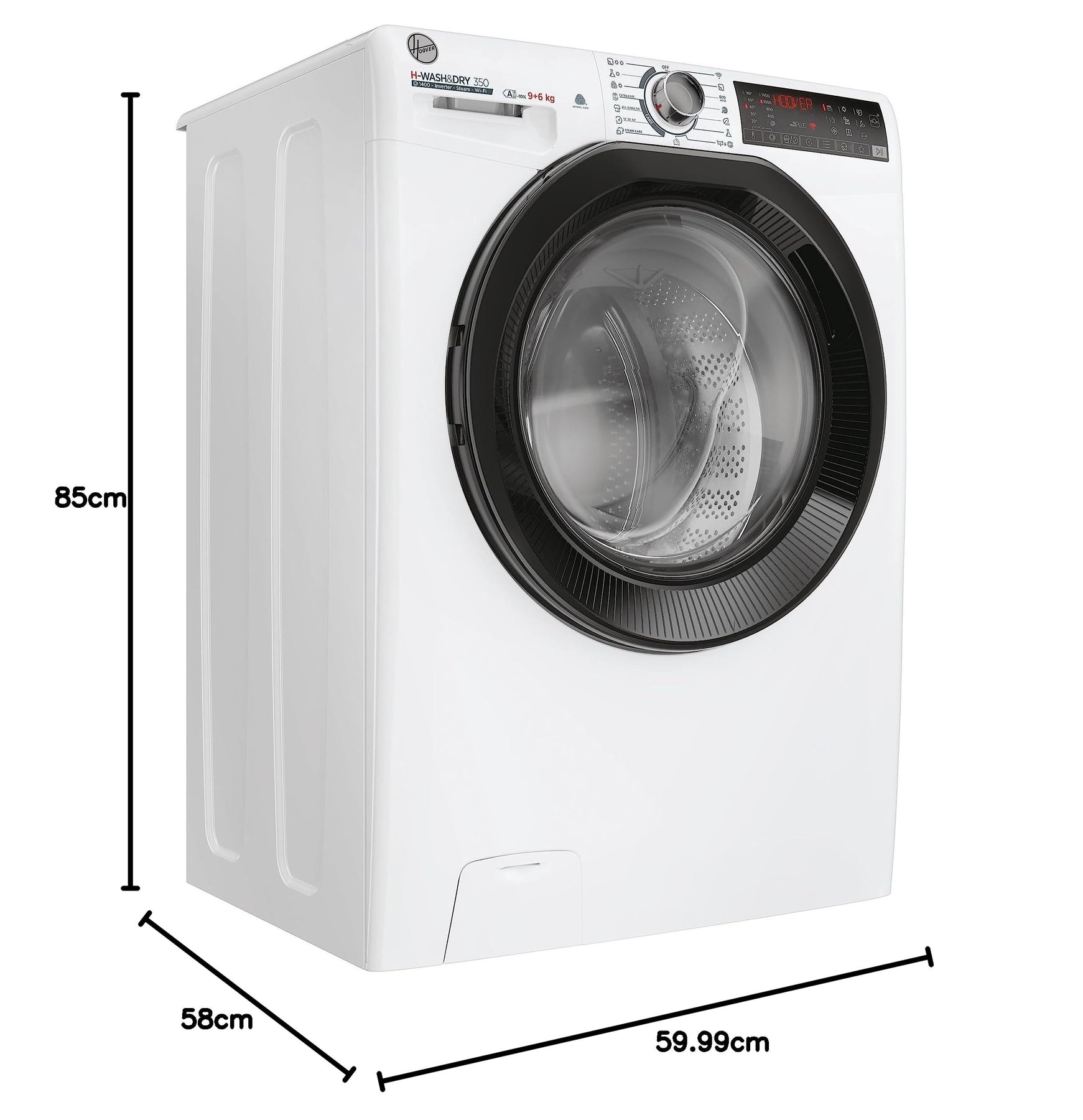 Das ästhetische H-WASH 350 Design, die Edelstahltrommel und die kompakten Produktabmessungen machen diesen Waschtrockner zu einer idealen Wahl für Ihr Zuhause. Die unverpackten Abmessungen betragen 85x60x58 cm (HxBxT) und die verpackten Abmessungen 89x65x60 cm (HxBxT). Das Bruttogewicht beträgt 66,0 kg und das Nettogewicht 64,0 kg.