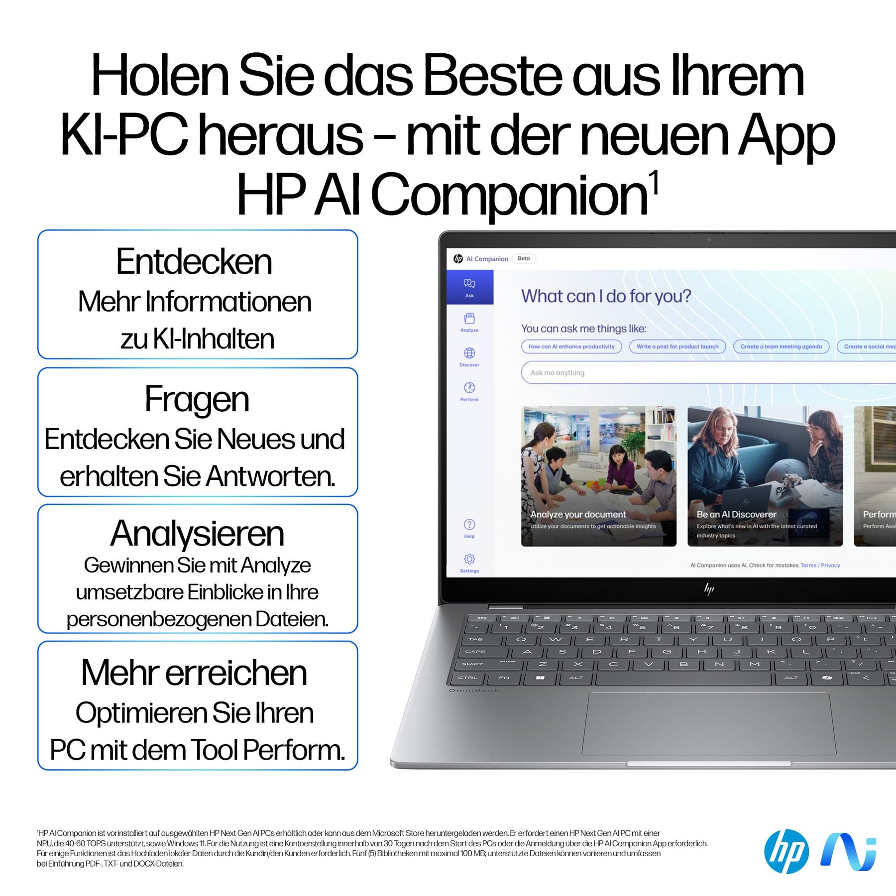 HP OmniBook X Next Gen AI Laptop | Qualcomm Snapdragon X Elite X1E-78-100 (12C) mit dedizierte NPU für KI | 45 NPU TOPS | Copilot+ PC | 14" 2,2K Touchscreen | 16 GB RAM | 1TB SSD | Win11 | Silber