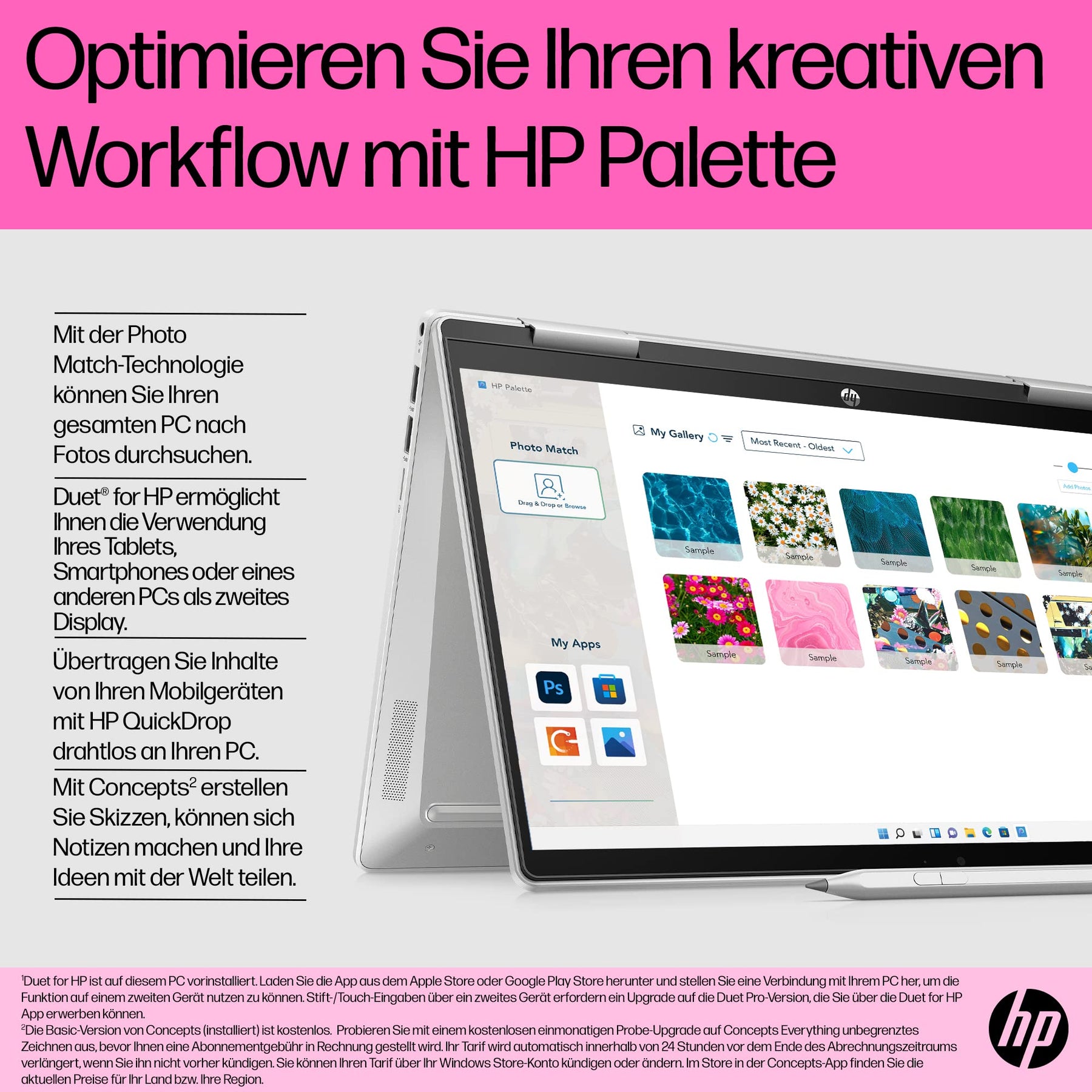 Einzelheiten: Mitreißende Unterhaltung ganz nach deinen Vorstellungen Der HP Pavilion x360 Laptop ist auf Flexibilität ausgelegt. Drehe den Bildschirm um 360°, um den perfekten Blickwinkel zu finden, und tauche mit den hochwertigen, individuell abgestimmten Lautsprechern tief in das Geschehen ein. Mit dem Intel® Prozessor[1] und dem HP Network Booster bist du zuverlässig und leistungsstark verbunden. Darüber hinaus wird dieser Laptop aus recycelten Materialien hergestellt[2].