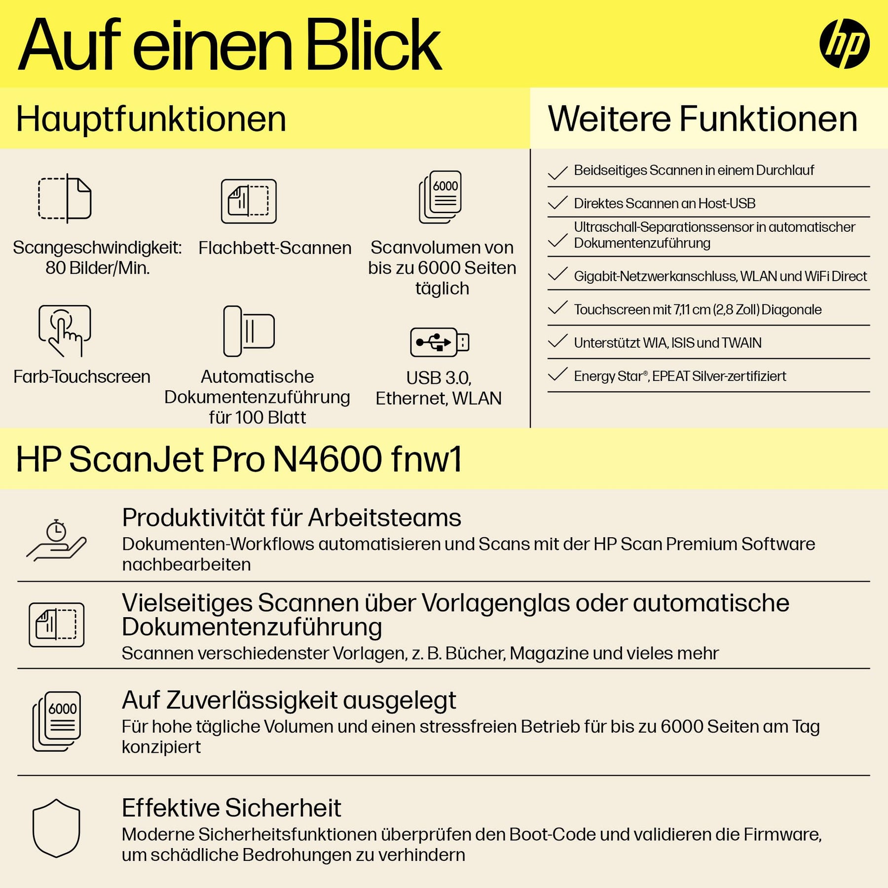 - Lieferumfang: HP ScanJet Pro N4600 fnw1 Scanner; Installationsanleitung; Support-Merkblätter; Polsterung; USB-Kabel; Netzteil; Netzkabel