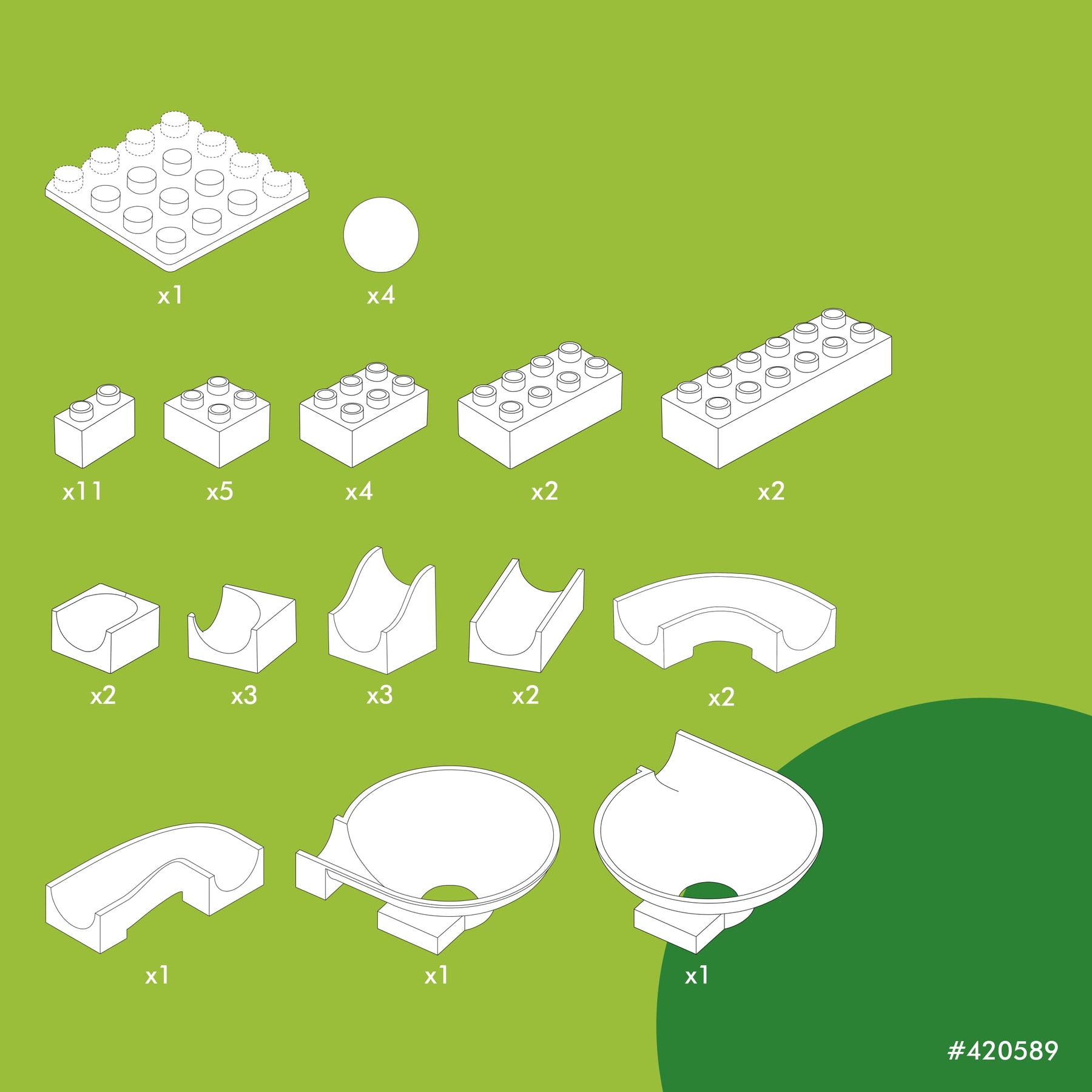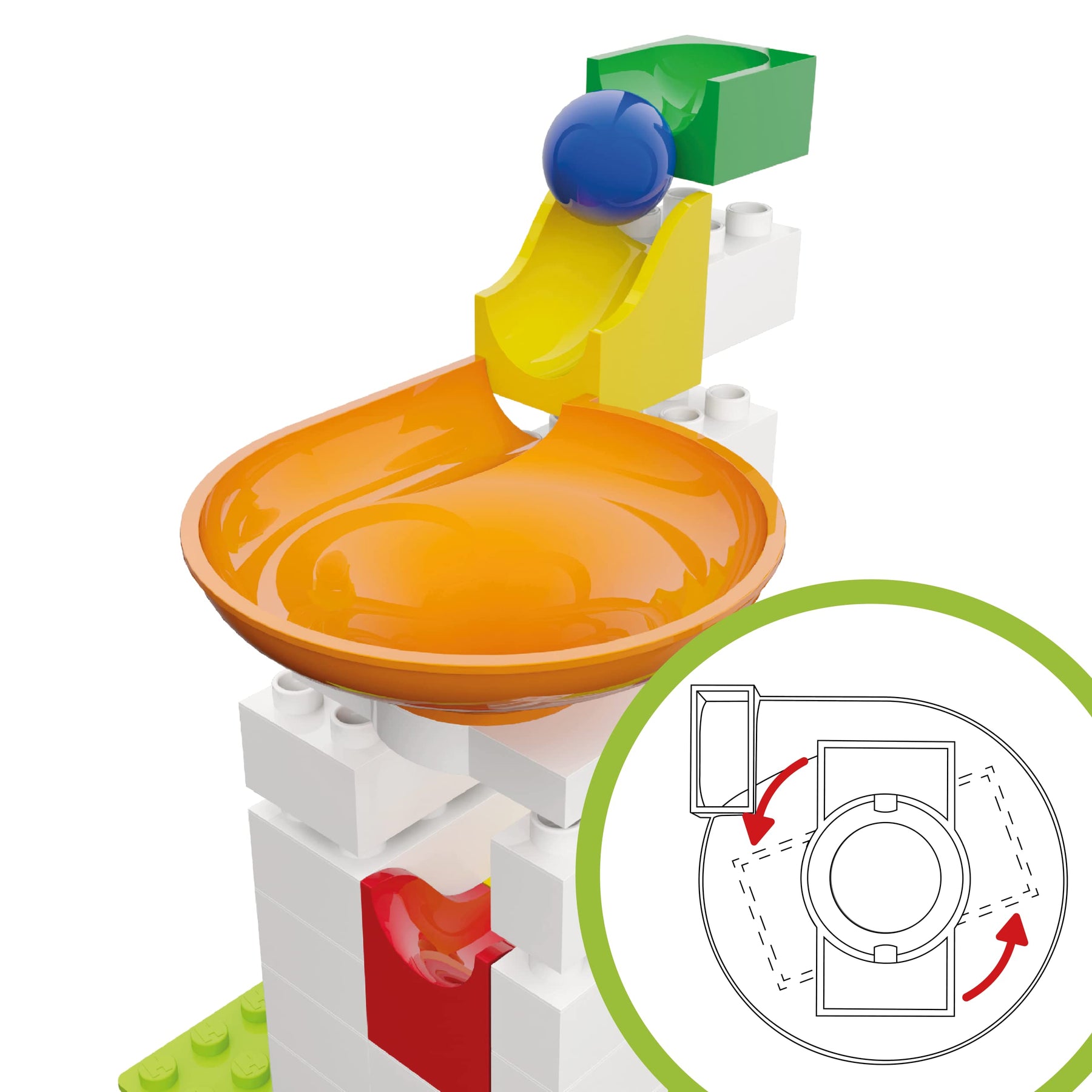 Die Trichter Erweiterung gibt der beliebtesten aller Kugelbahn Erweiterungen noch mehr Einsatzmöglichkeiten. Die Laufeigenschaft ist durch den konischen Trichter verbessert, die Kugel kreist erst ganz langsam und wird immer schneller je weiter sie in den Trichter hineinläuft. Dadurch kann der Trichter auch viele Kugeln gleichzeitig aufnehmen. Außerdem ist der neue Trichter drehbar und kann dadurch flexibel in die Kugelbahn eingebaut werden. In der Trichter Erweiterung sind neben Bahnelementen, Bausteinen, einer Grundplatte und vier Kugeln insgesamt zwei Trichter enthalten sowie ein Anleitungsheft mit zwei Aufbauvorschlägen. Mit dem Set kann eine kleine eigenständige Kugelbahn gebaut werden oder die Bauteile werden in eine große Kugelbahn integriert. Mit der modularen und kompatiblen Kugelbahn, bei der nichts verwackelt oder verrutscht, werden räumliches Vorstellungsvermögen und erste physikalische Gesetze vermittelt. Egal ob mit oder ohne Bauanleitung, der farbenfrohe Aufbau schult das Einhalten von Reihenfolgen, regt das Arbeitsgedächtnis an und trainiert das analytische Denkvermögen. Und das beste daran ist, dass die Hubelino Kugelbahn auf ein vorhandenes System aufbaut und so die Nutzungsdauer verlängert. Alle Bauteile aus der 44-teiligen Trichter Erweiterung sind kompatibel mit gängigen Bausteinen anderer Hersteller und können dadurch kreativ mit deinen vorhandenen Bausteinen und Themenwelten kombiniert werden. Wie alle Produkte von Hubelino, wird auch die Trichter Erweiterung in Deutschland unter höchsten Qualitätsstandards gefertigt.