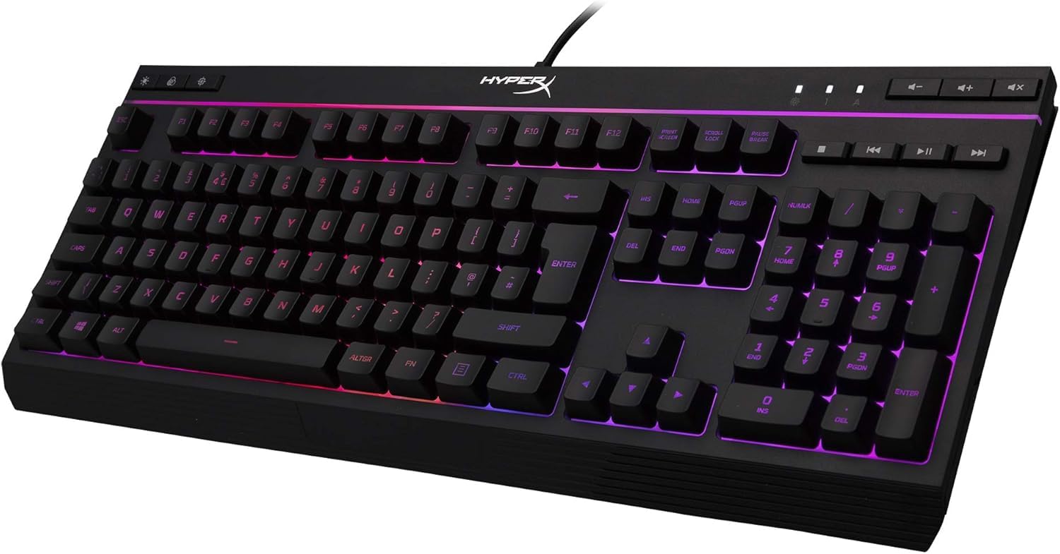 Mit der einzigartigen HyperX Lichtleiste und den dynamischen RGB-Beleuchtungseffekten ist die HyperX Alloy Core RGB ideal für alle Gamer, die sich noch mehr Style und Leistung für ihre Tastatur wünschen, ohne dafür ein Vermögen ausgeben zu wollen. Mit sechs verschiedenen Beleuchtungseffekten und drei Helligkeitsstufen ist diese Tastatur so genial wie günstig. Die Alloy Core RGB ist mit einem widerstandsfähigen, verstärkten Kunststoffrahmen auf Stabilität und Zuverlässigkeit ausgelegt und damit perfekt für alle Gamer, die eine langlebige Tastatur suchen. Die Tasten mit Soft-Touch fühlen sich taktil an, sind dabei aber dennoch leise und unterstützen Anti-Ghosting-Funktionalität und Key-Rollover für echte Gamer-Ansprüche. Die Tastatur ist spritzwassergeschützt und getestet um eine Flüssigkeitsmenge von 120 ml standzuhalten. Ein umgeworfenes Glas beendet also noch kein Spiel! Die eigene Mediensteuerung und die Schnellzugriffstasten für Helligkeit, Lichteffekte und Gaming-Mode überlassen Ihnen die volle Kontrolle. Mit der Tastatursperre können Sie die Tastatur sperren, ohne das gesamte System in den Standby-Modus versetzen zu müssen. Die Alloy Core RGB ist stylisch, gut ausgestattet und langlebig und damit eine großartige Allround-Multimedia-Tastatur für Gamer.