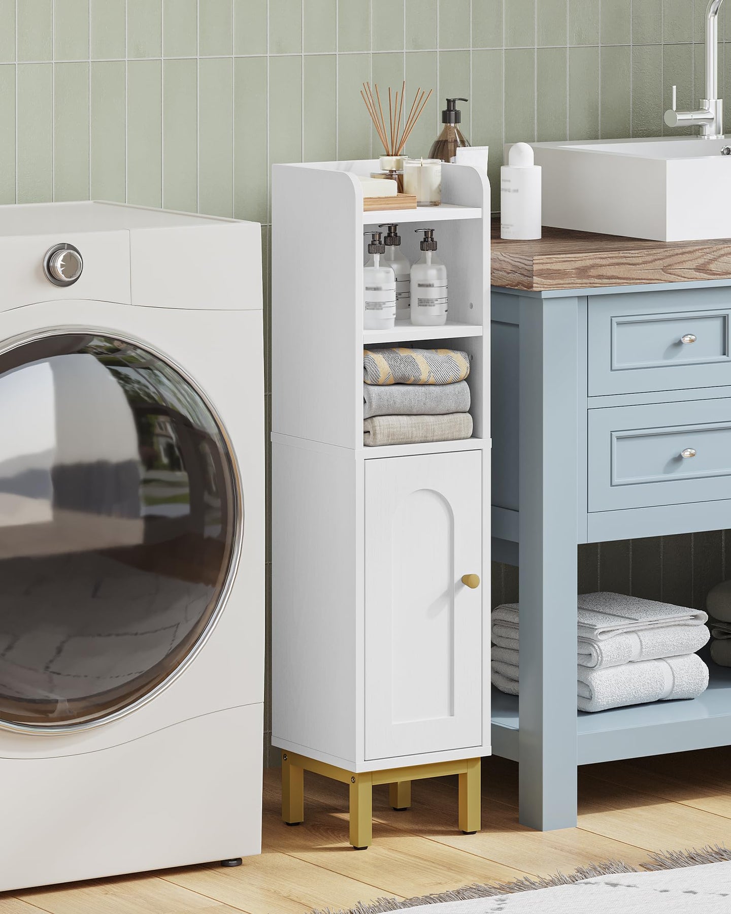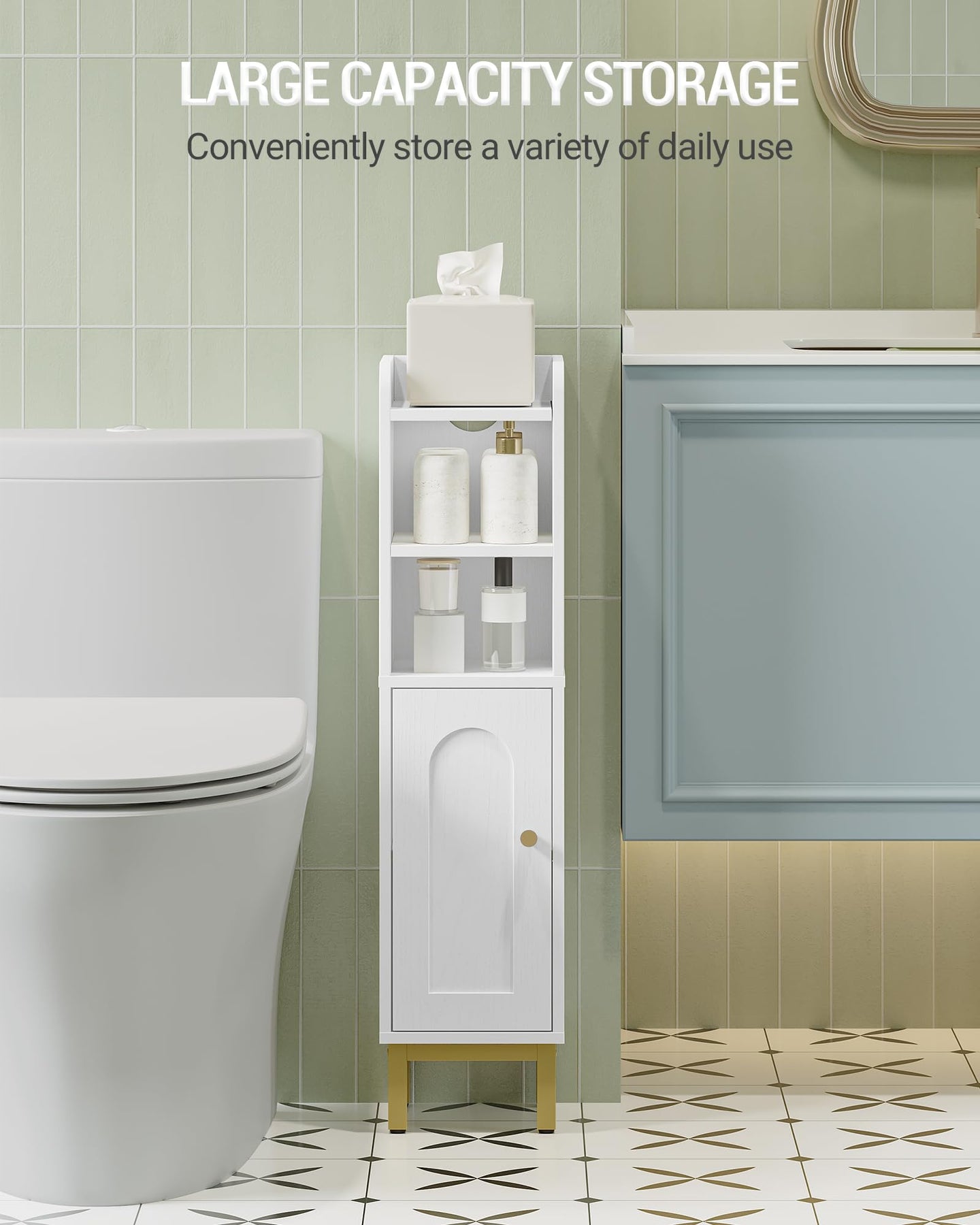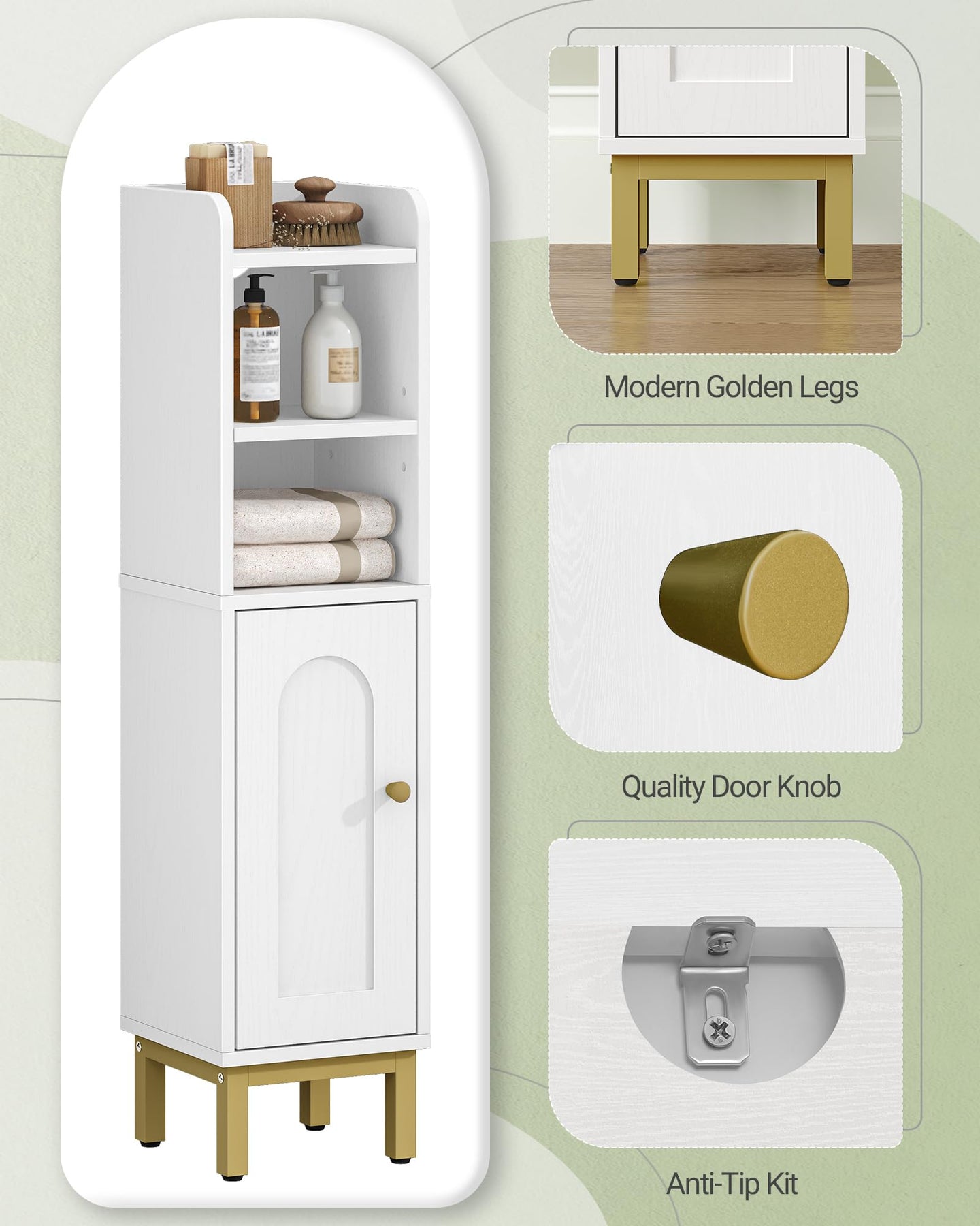 - Geeignet für enge Räume: Dieser elegante und platzsparende Badezimmerschrank mit den Maßen 20 x 20 x 83cm passt perfekt in enge Räume. Das gewölbte Türdesign und die vier goldenen Beine verleihen Ihrem Badezimmer eine ästhetische Note