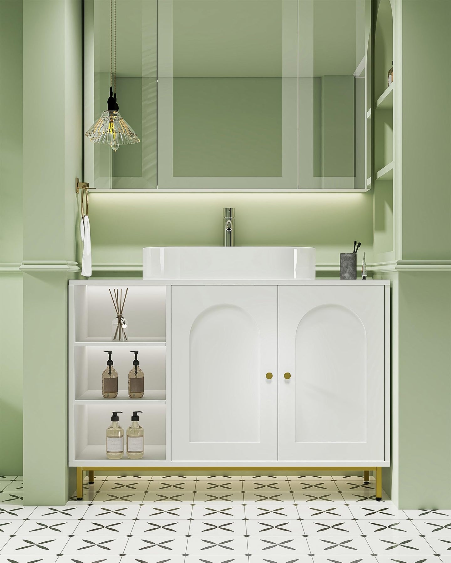• 【Einzigartiges Design】Die gewölbte Tür und der goldene Sockel verleihen dem Bad Schönheit und Wasserdichtigkeit, die Metallbeine erhöhen die Stabilität und haben verstellbare Füße, damit Sie sich keine Sorgen mehr über unebene Böden machen müssen.