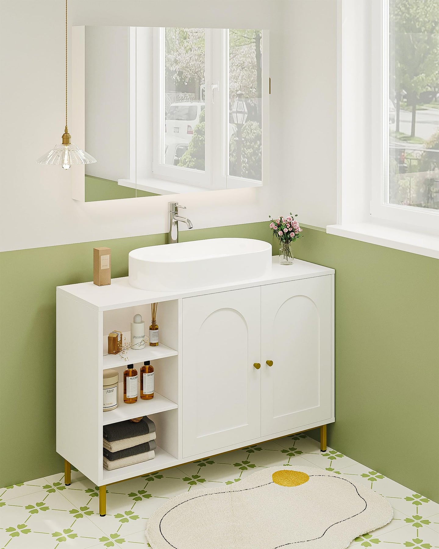 • 【Versatile Sink Cabinet】Dieser Badezimmerschrank wurde entwickelt, um unter Ihr offenes Waschbecken zu passen, mit einem U-förmigen Design, das bequemen Stauraum für Ihr Badezimmer bietet,Die offenen Fächer für einfachen Zugang und das Doppeltürdesign verhindern effektiv, dass Ihre Gegenstände nass werden.