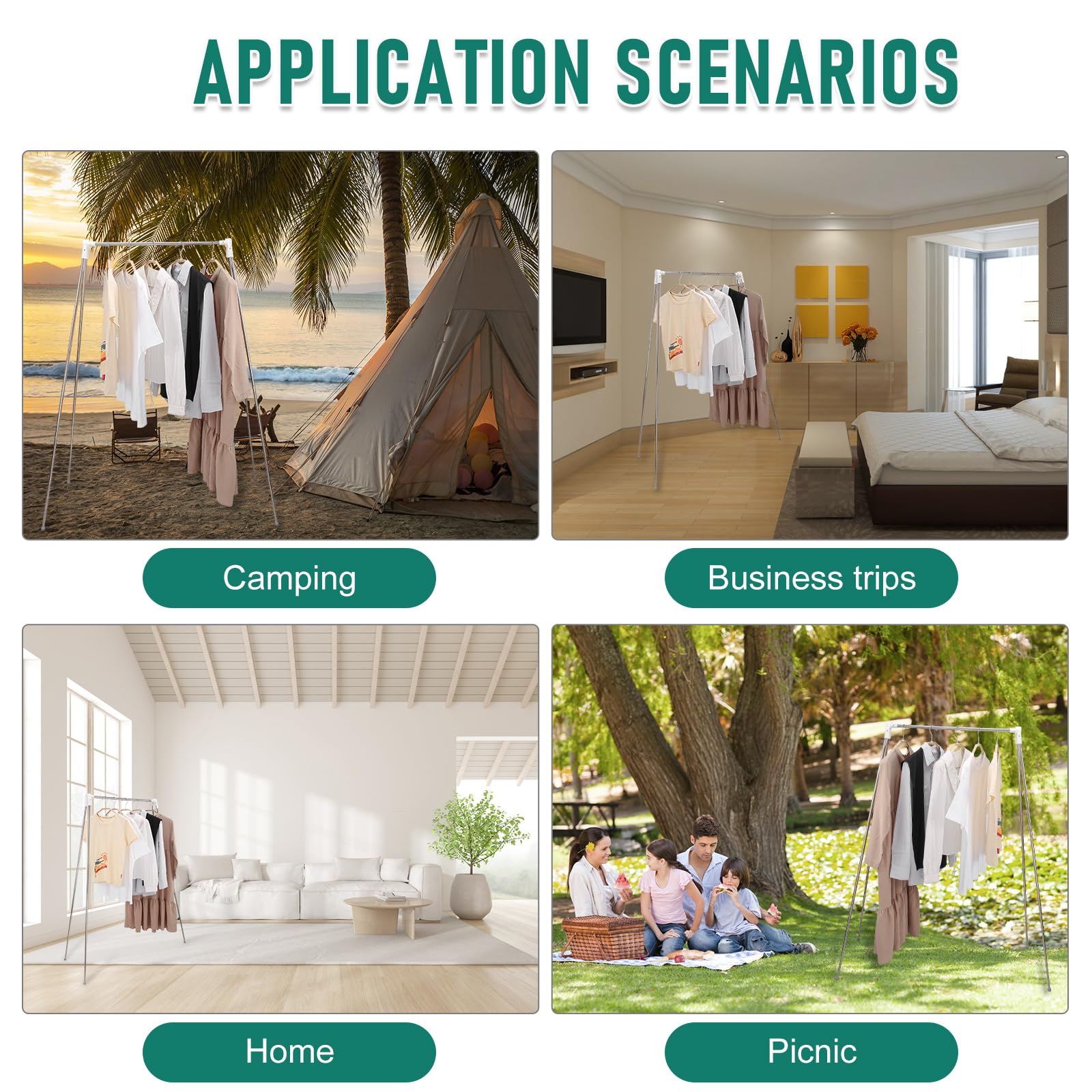 • 【Anwendbar auf verschiedene Anlässe】 Dieser zusammenklappbare Kleiderständer eignet sich für Reisen, Camping, Bergsteigen, Wandern, Tanzen, Wäschewaschen, Schlafsaal, Geschäft, Hotel, Wohnung, Garten, Studentenwohnheim, Bügeln von Kleidung usw.