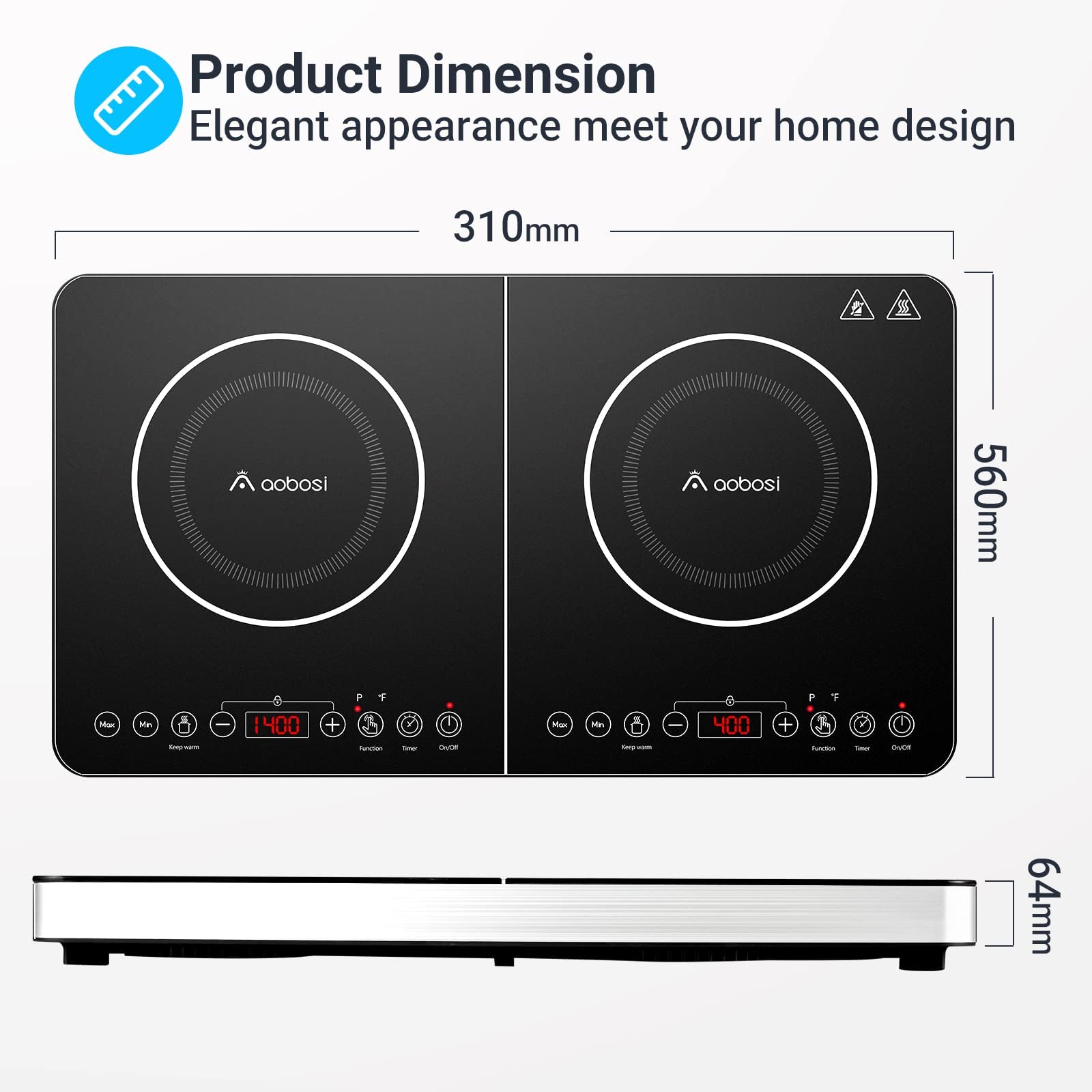 • 🍟【Zweizonen-Heizungsdesign】Das professionelle Induktionskochfeld von Aobosi ist mit zwei unabhängigen Heizzonen ausgestattet, die es Ihnen ermöglichen, jede einzeln über den LCD-Bildschirm einzustellen. Die maximale Leistung des linken Brenners beträgt 2000 Watt und die maximale Leistung des rechten Brenner ist 1500 Watt. Dieser Doppel-Induktionskocher kann Ihnen viel Zeit und Stromrechnungen sparen.Hinweis: Lassen Sie den Topf während des Gebrauchs nicht den mittleren Nahtstreifen berühren.