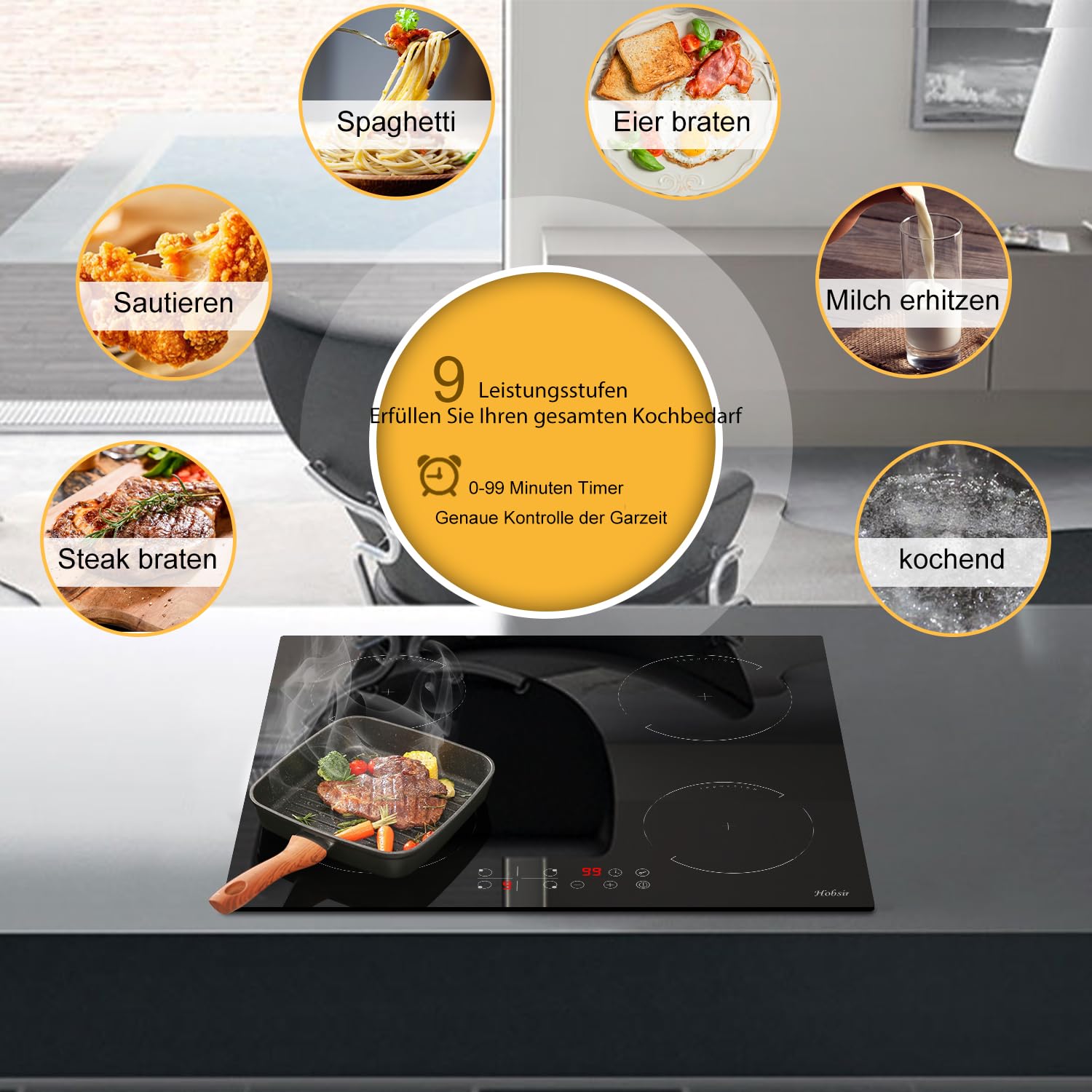 - 🥩【Präzise Leistungsstufen und Timer】Wechseln Sie zwischen 9 einstellbaren Hitzestufen, egal ob Sie braten, frittieren oder kochen möchten. Der Timer kann auf bis zu 99 Minuten eingestellt werden. Wenn die eingestellte Zeit abgelaufen ist, schaltet sich das induktionskochfeld 60 cm automatisch aus.
