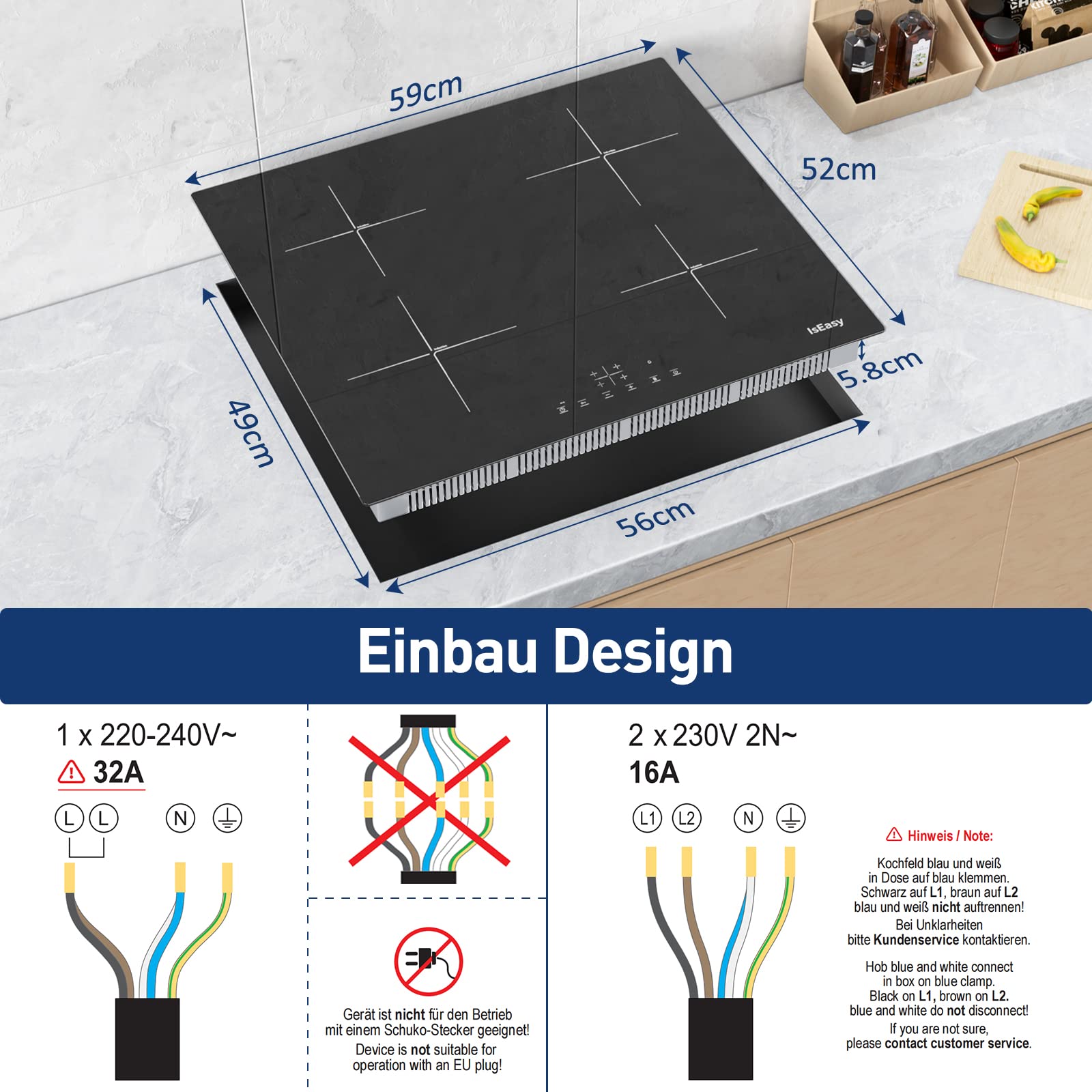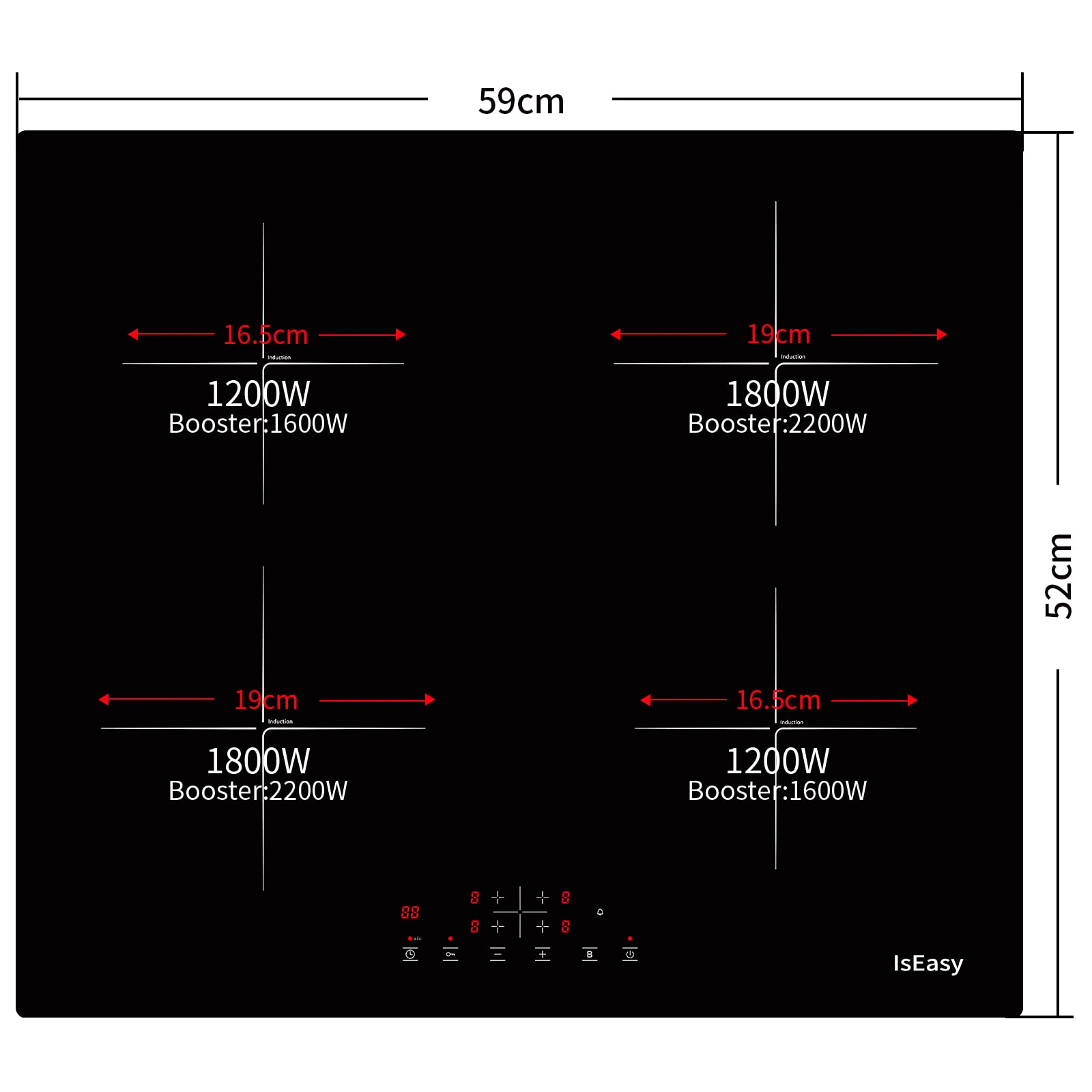 - ❤️【Induktionskochfeld 4 platten】: Maximale Nennleistung: 6800W. Booster: 1600W/2200W, 220–240V. Produktgröße: 59 x 52 x 5,8 cm. Ausschnittgröße: 57 x 49,5 cm.