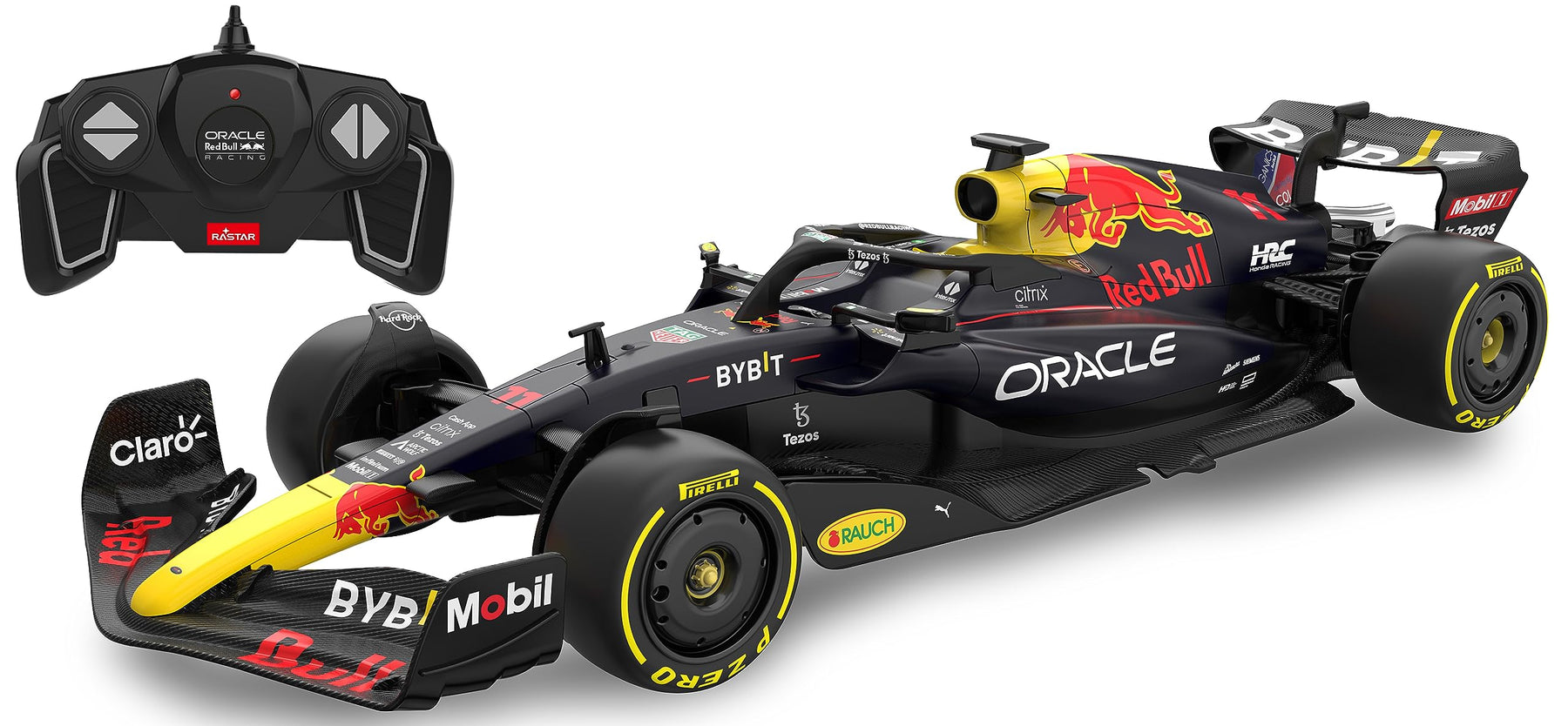 • Der ferngesteuerte Oracle Red Bull Racing RB18 ist die offiziell lizenzierte RC-Version des Formel-1 Fahrzeugs des Rennfahrers Sergio Perez. Vom kleinsten Logo bis zu den Pirelli-Reifen bis ins Detail wie das Original.