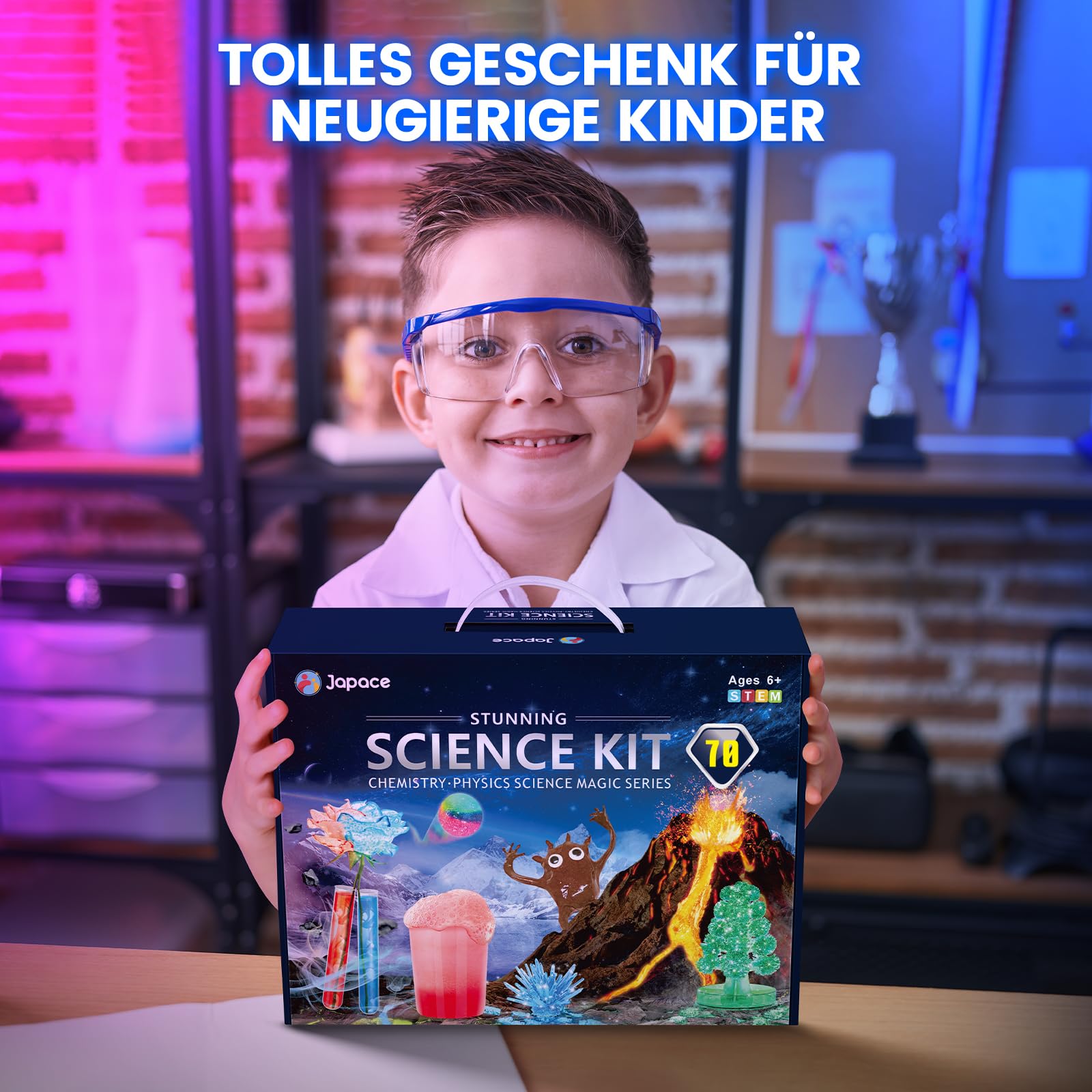 • 【70 COOLSTE EXPERIMENTE FÜR KINDER】 Japace Wissenschaft Kit enthält unsere beliebtesten Experimente aus den Bereichen Geowissenschaften, Chemie und Magie. Bauen Sie einen Vulkan und lassen Sie ihn ausbrechen, färben Sie einen schäumenden Brunnen, Hüpfbälle herstellen, lassen Sie Kristalle und Weihnachtsbäume wachsen. Ändern Sie die Farbe einer Blume, blasen Sie einen Luftballon mit Wasser auf, lassen Sie einen Regenbogen plätzen und vieles mehr.