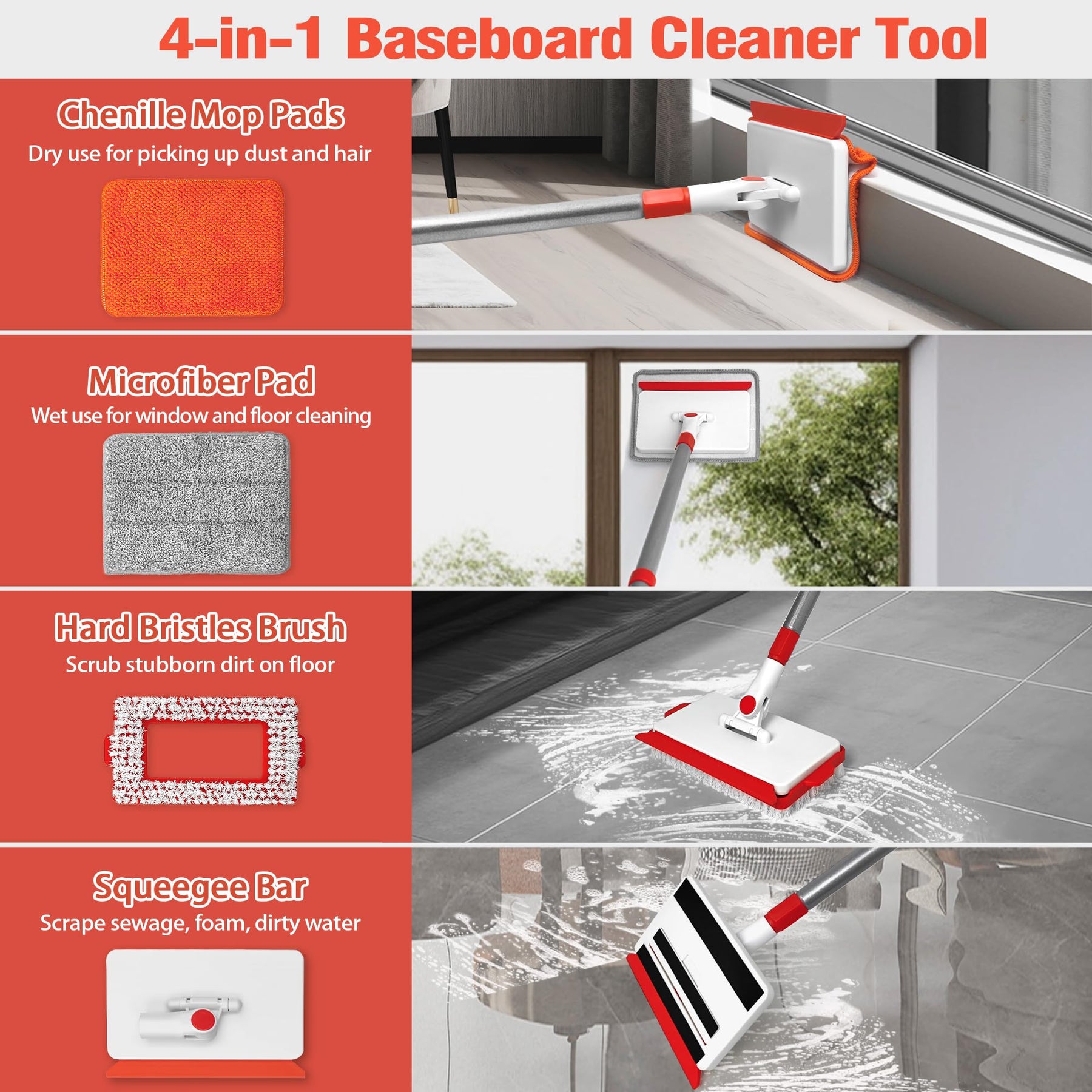 JEHONN Wischmopp Fliesenreiniger Gerät mit Langem Griff 142 cm, Wand und Fußleisten Reiniger, 4-in-1 Fliesen Reinigungsgerät mit 1 Bürste, 2 Chenille, 2 Mikrofaserpads für Fußbodenleiste