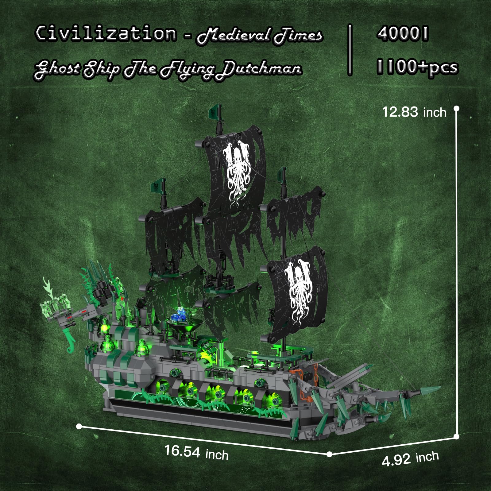 - Lebendige grüne LED-Beleuchtung: Ausgestattet mit 9 grünen LED-Perlen, schließen Sie einfach die Stromquelle an, um die Lichter einzuschalten, indem Sie das Modell mit einer eigenartigen und bezaubernden grünen Ausstrahlung versorgen und eine immersive geheimnisvolle Atmosphäre schaffen. Aber es geht nicht nur um die Beleuchtung – die Seitenaufkleber unseres Piratenschiffs verfügen auch über ein nachtleuchtendes Design, das den Effekt noch verstärkt. In der Dunkelheit leuchtet es im Einklang mit den Lichtern des Geisterschiffs und schafft so ein wirklich erstaunliches visuelles Spektakel