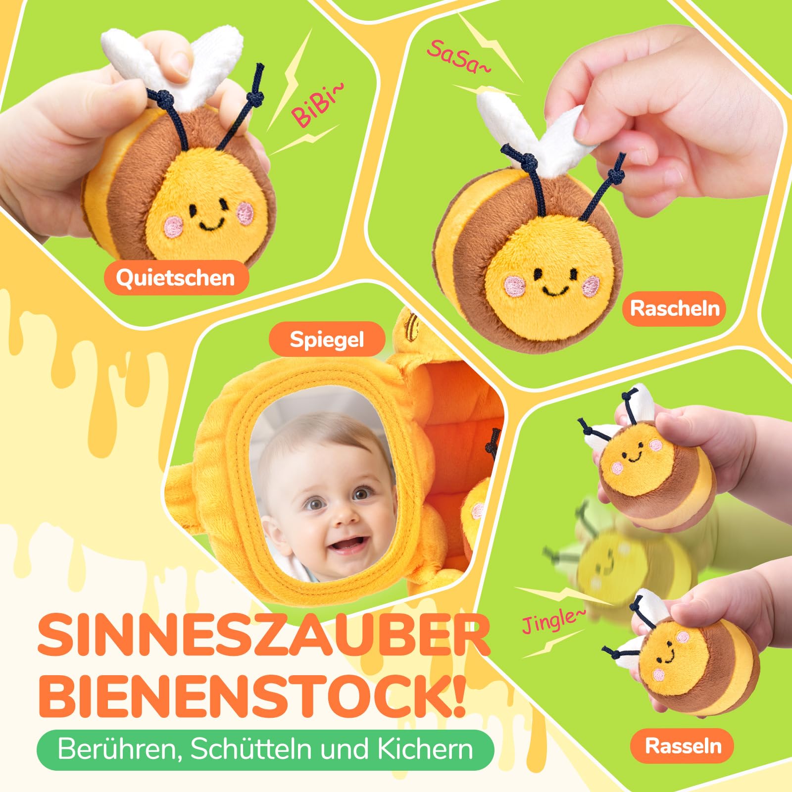 - 【Baby Sensorik-Spielzeug】: Begleitet von fünf fröhlichen Bienen mit knisternden Flügeln, Rasseln und Quietschern erlebt euer Baby ein sinnliches Abenteuer. Das speziell für kleine Hände entwickelte BabySpielzeug fördert spielerisch die Sinneswahrnehmung und Feinmotorik und bietet gleichzeitig endlosen Spaß und Entdeckungserlebnisse.
