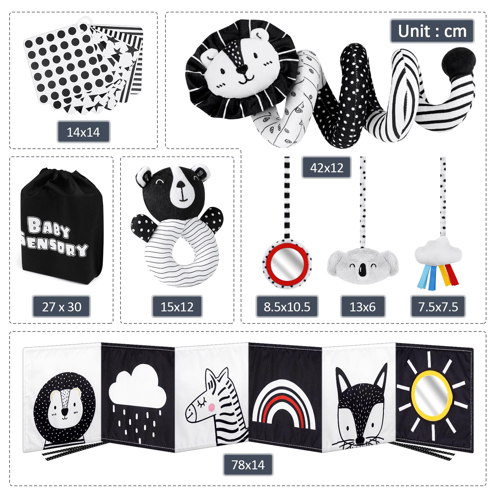 • 【Neugeborenen Sensorik Spielzeug】- Unser kontrast spielzeug baby set enthält 1 spiral Kinderwagen Spielzeug, 1 rassel baby, 1 kontrastbuch baby, 8 schwarz weiss kontrastkarten Sinneskarten und eine Aufbewahrungstasche. Eine wunderbare Ergänzung für Ihren Kinderwagen und Autositz, der hohe Kontrast lässt Ihr kleines Kind starren und bleibt während Ausflügen unterhalten und beschäftigt.